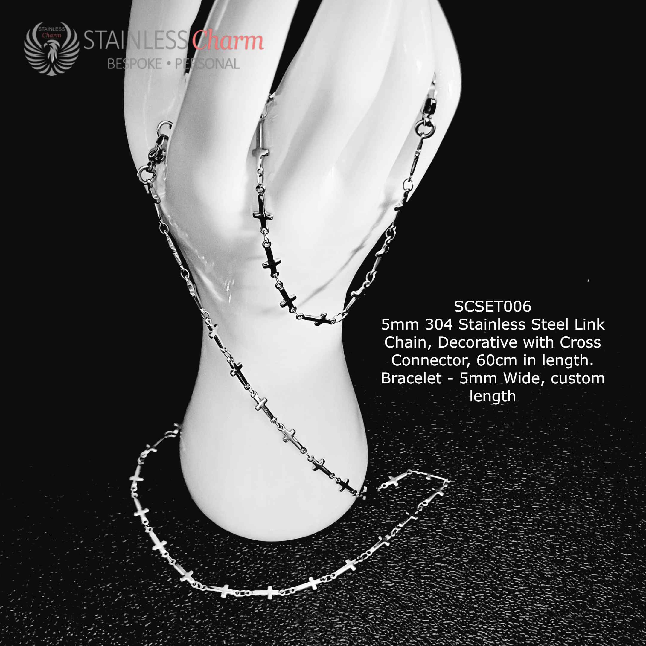 Elevate your accessories with this striking set, crafted from premium 304 stainless steel for durability and elegance. The 5mm wide chain, featuring intricate cross connectors, measures 60cm in length, while the matching bracelet is available in customizable lengths to ensure a perfect fit.