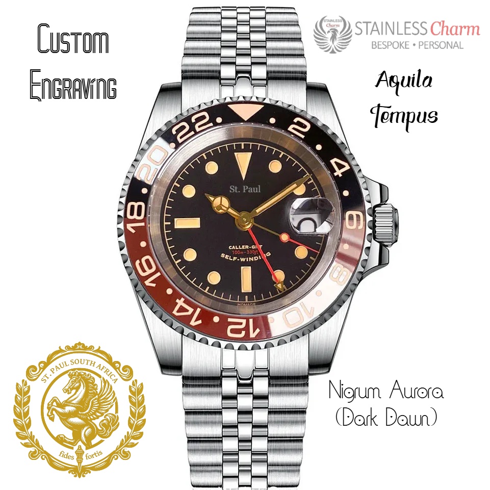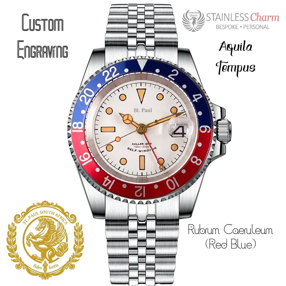 The Aquila Tempus offers four distinct bezel options, each designed to suit a range of styles and preferences. Choose from Aurum Tenebris, a striking fusion of gold and shadow tones for a bold statement; Argentum Aeternus, embodying timeless elegance with its enduring silver finish; Rubrum Caeruleum, a vibrant interplay of red and blue for those who dare to stand out; or Nigrum Aurora, a sophisticated blend of black and warm reddish-brown, inspired by the essence of a ‘Dark Dawn.’ Each bezel option captures the unique spirit of the Aquila Tempus, combining artistry with precision.