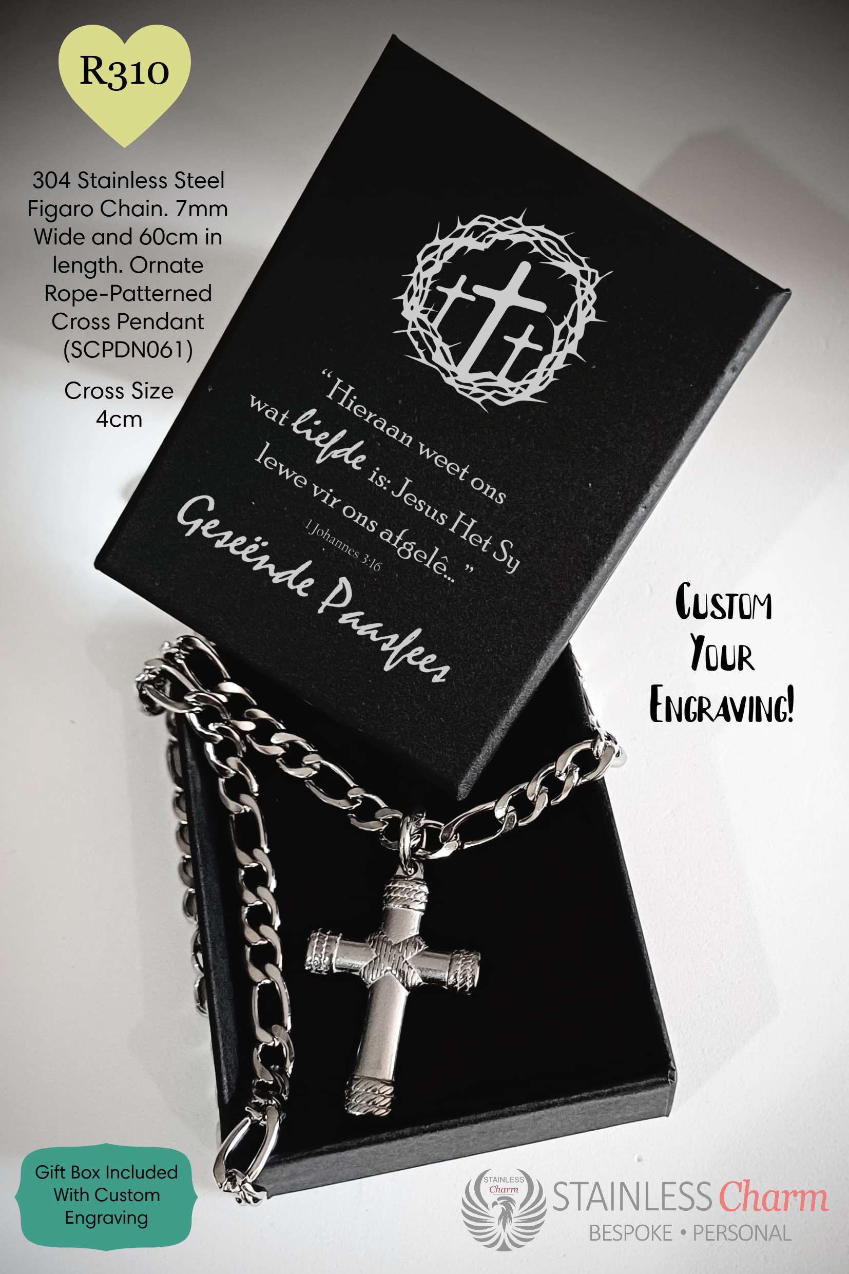 Celebrate Passover with this exquisite and meaningful jewelry set. Encased in a custom-engraved black gift box, the design features three crosses surrounded by a crown of thorns and the heartfelt text: “Hieraan weet ons wat liefde is: Jesus het sy lewe vir ons afgele.” (Johannes 3:16), along with “Geseënde Paasfees.”