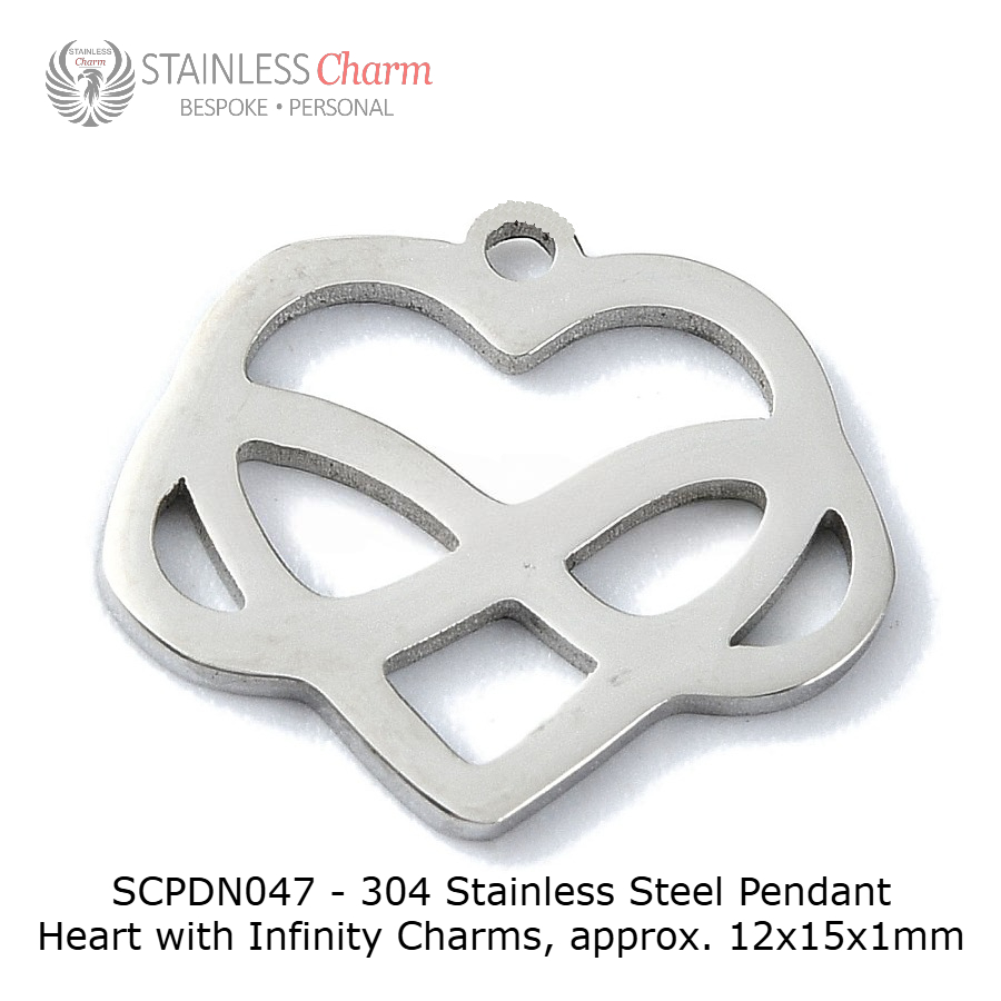 Tarnish Resistant 304 Stainless Steel Cable Chain 2mm wide and 50cm in length. Heart with Infinity Charm Pendant