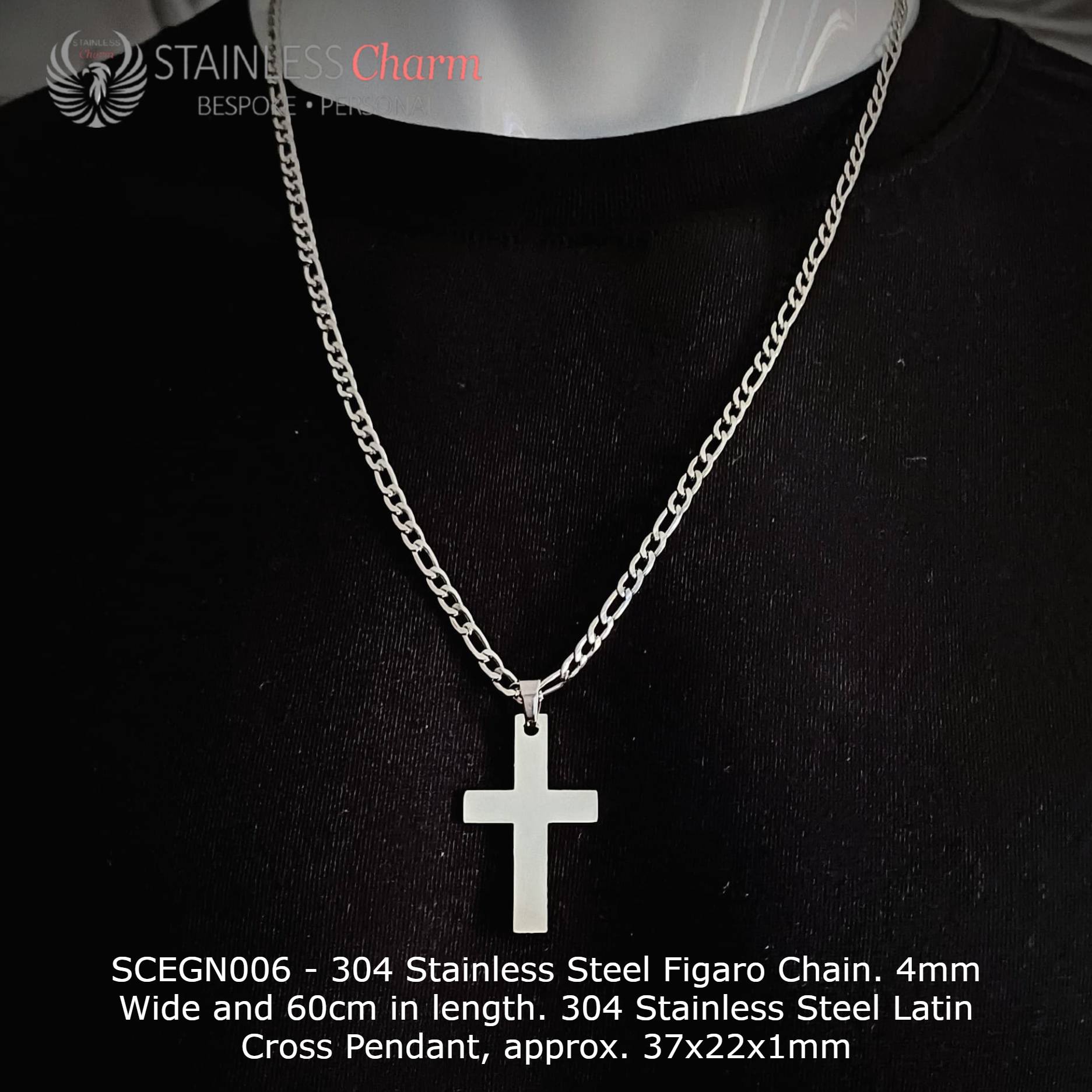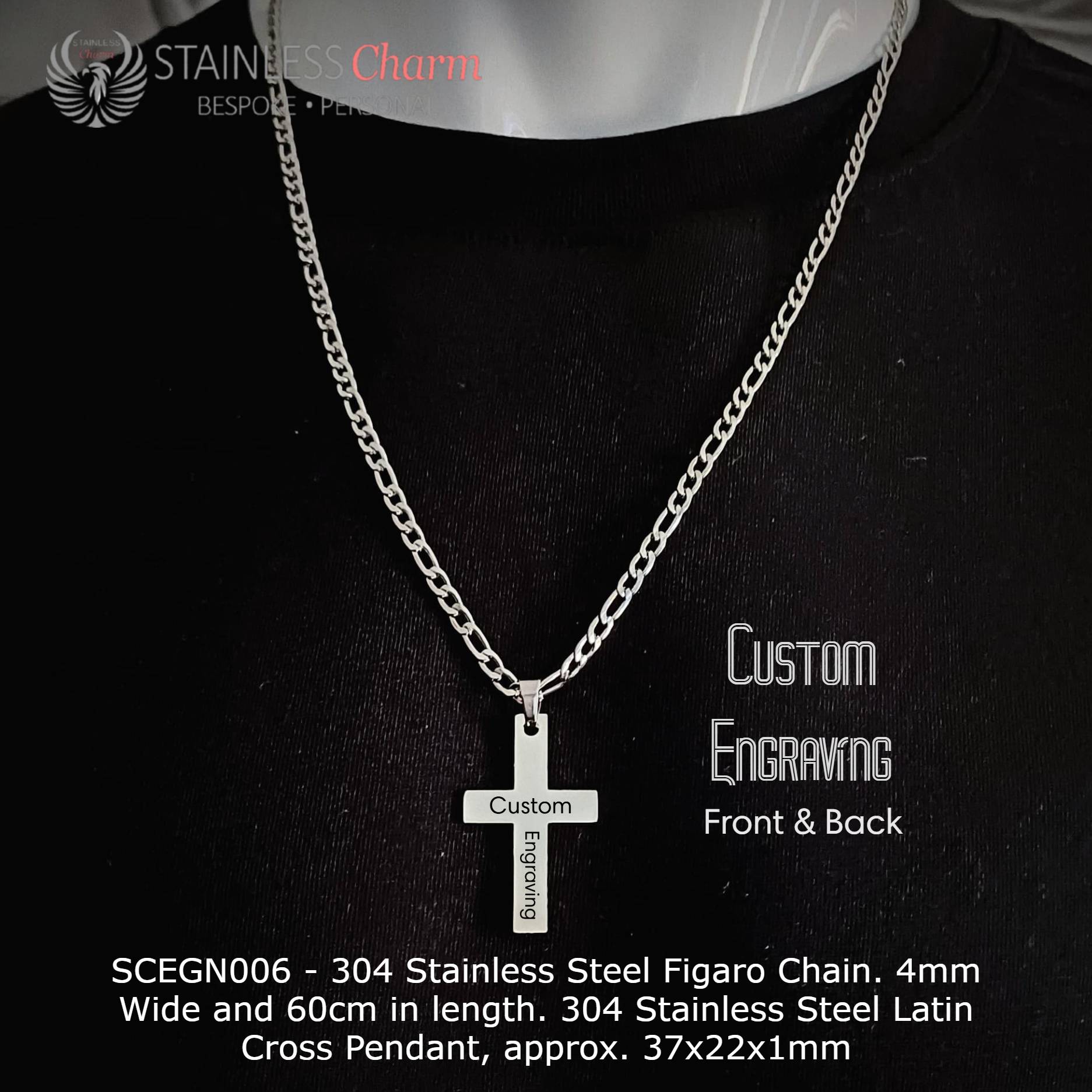 - Pendant: 304 stainless steel Latin cross pendant (37x22x1mm), customizable with engraving on both the front and back.