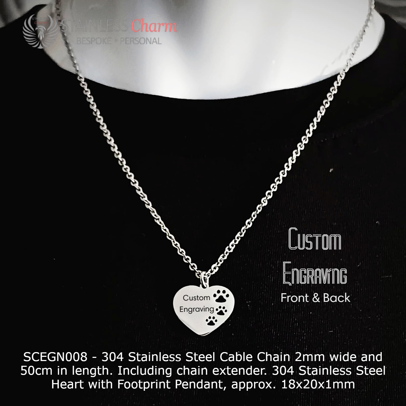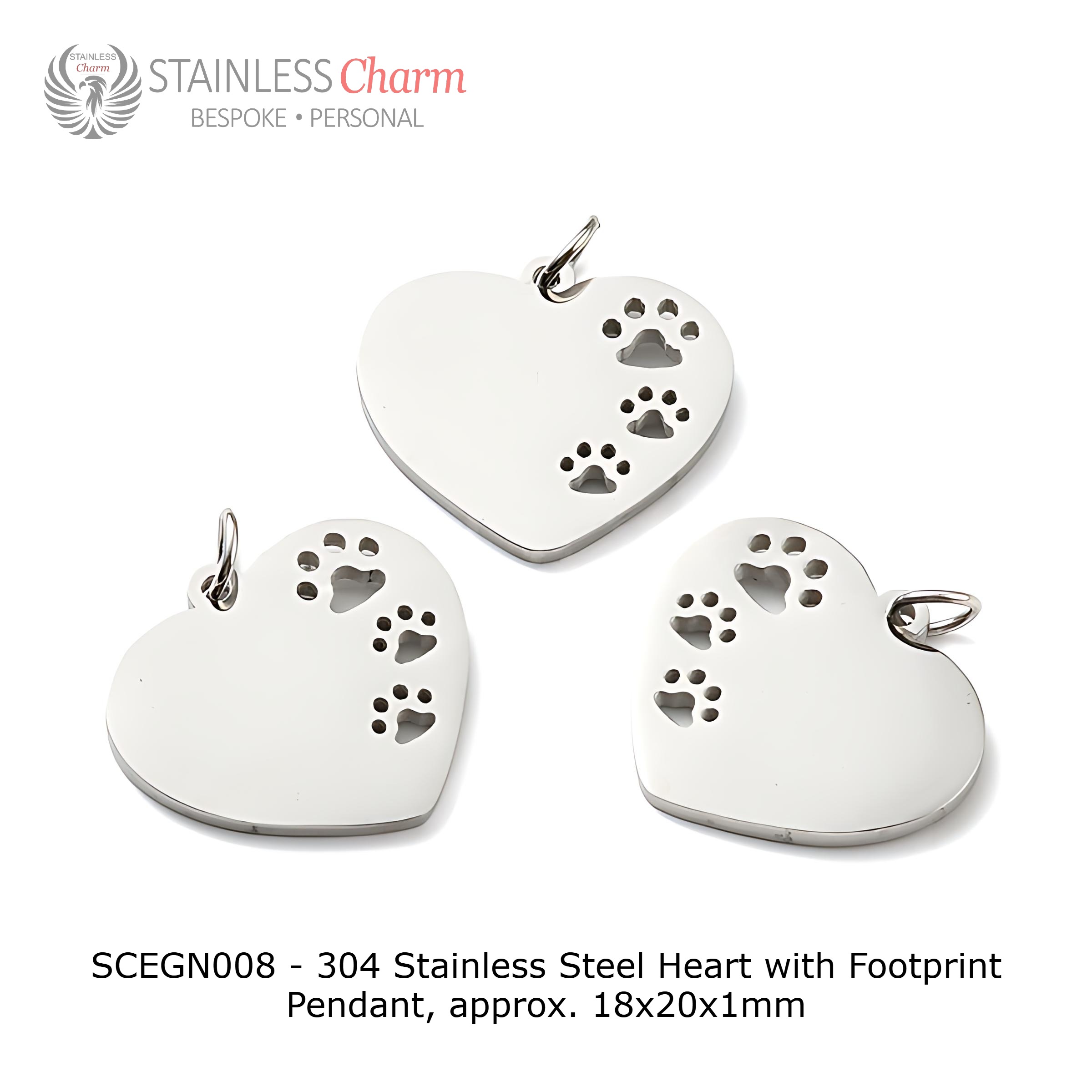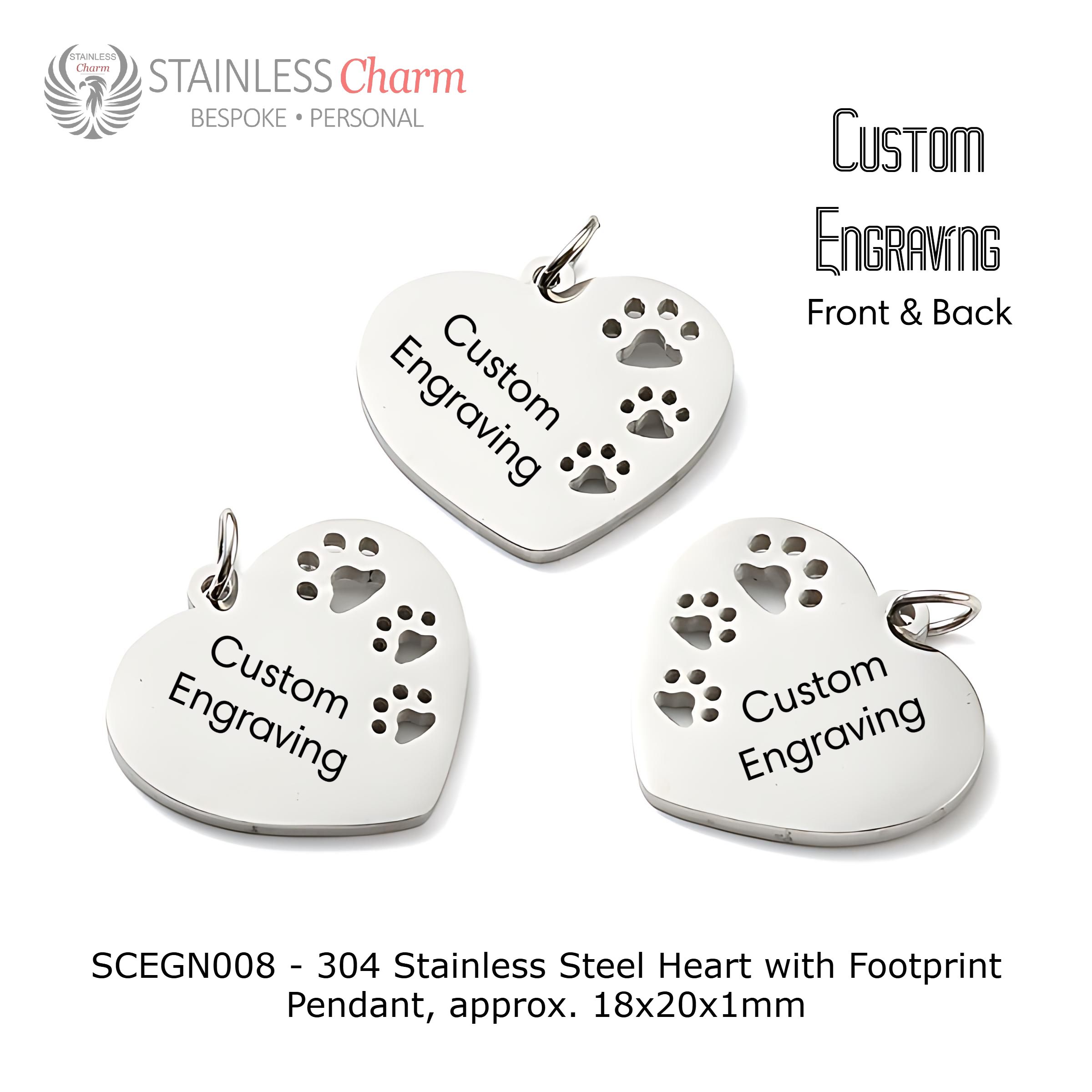 - Pendant: 304 stainless steel heart pendant (approx. 18x20x1mm) with a charming paw print design. Customize both the front and back with engraving options.