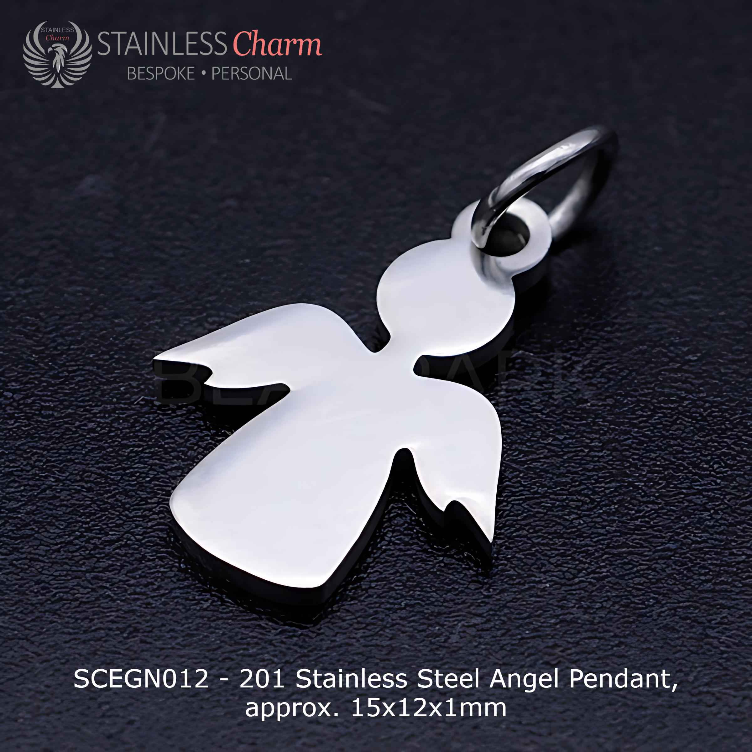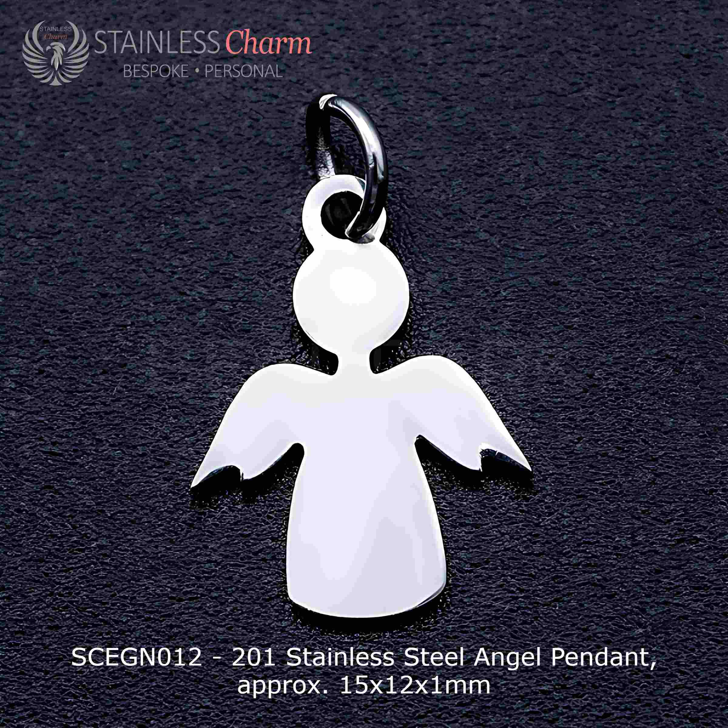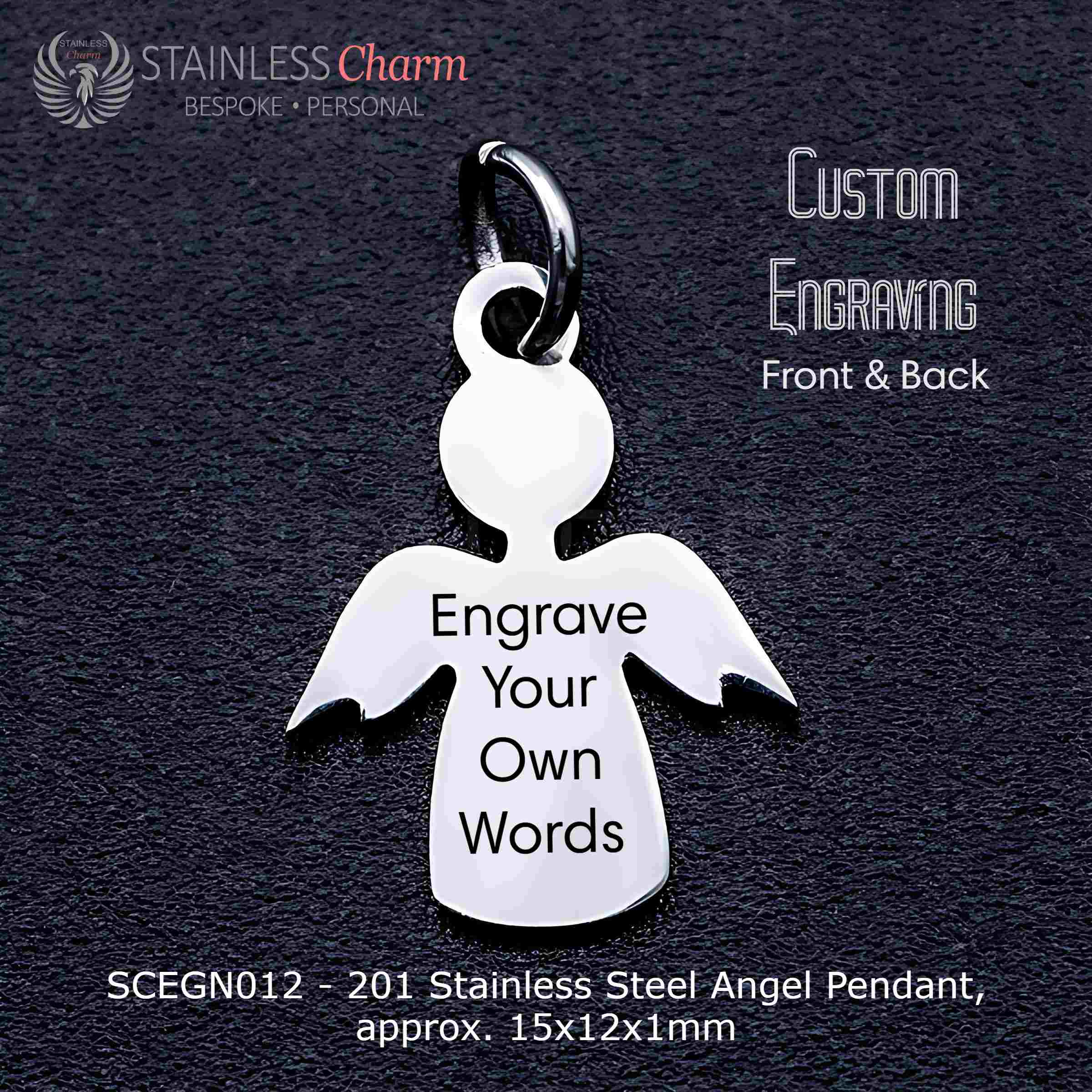 - Pendant: 201 stainless steel angel-shaped pendant (approx. 15x12x1mm), customizable with engraving on both the front and back.