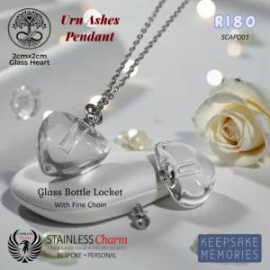 A delicate tribute to cherished memories, this heart-shaped glass urn pendant is designed to hold a small amount of ashes, sand, or symbolic keepsakes. Measuring 2cm x 2cm, the transparent glass bottle offers a glimpse into remembrance, suspended on a fine chain for graceful wear. The screw-top closure ensures secure sealing, while the minimalist design blends sentiment with elegance. Ideal for memorial gifting or personal keepsake wear.