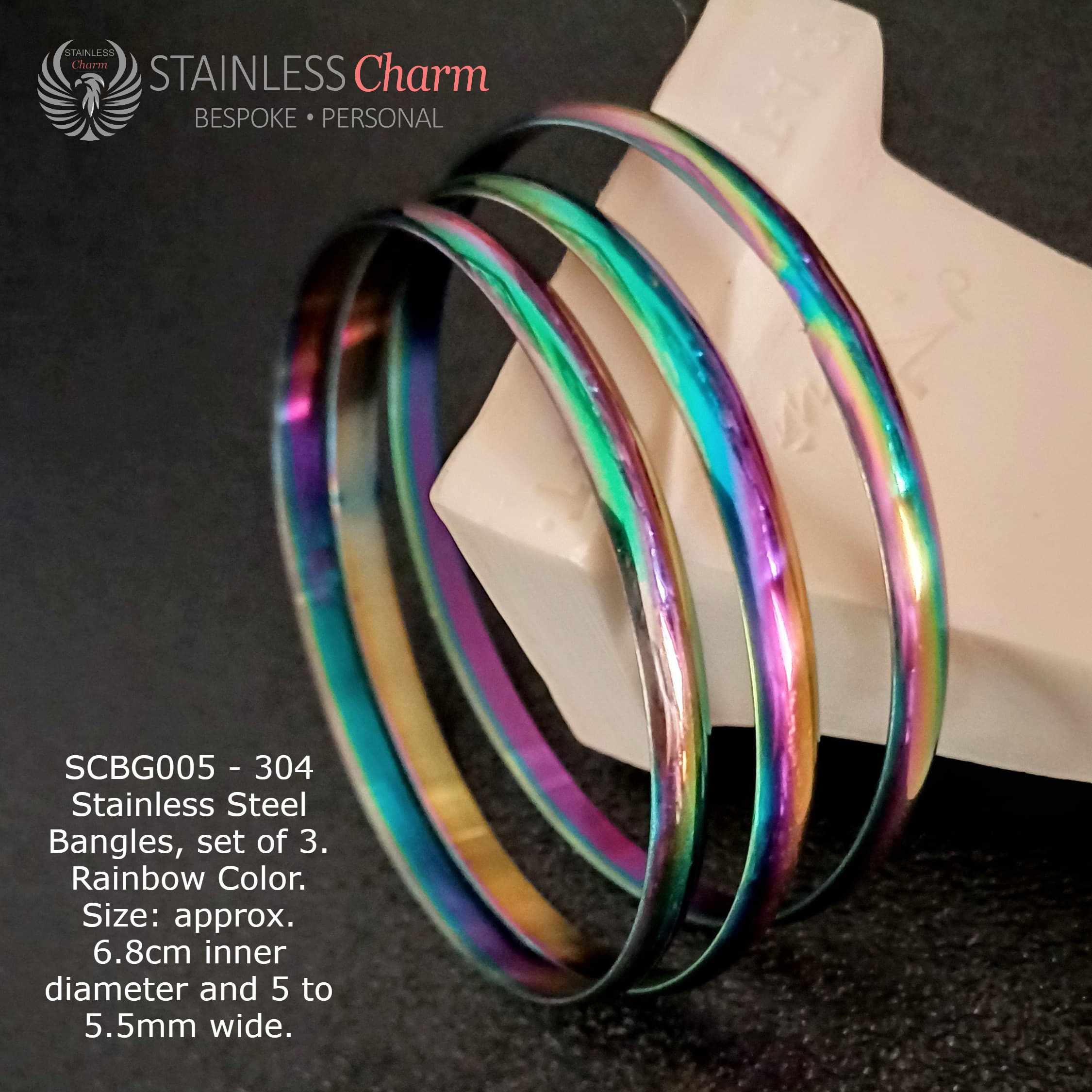 304 Stainless Steel Bangles, set of 3. Rainbow Color. Size: approx. 6.8cm inner diameter and 5 to 5.5mm wide.