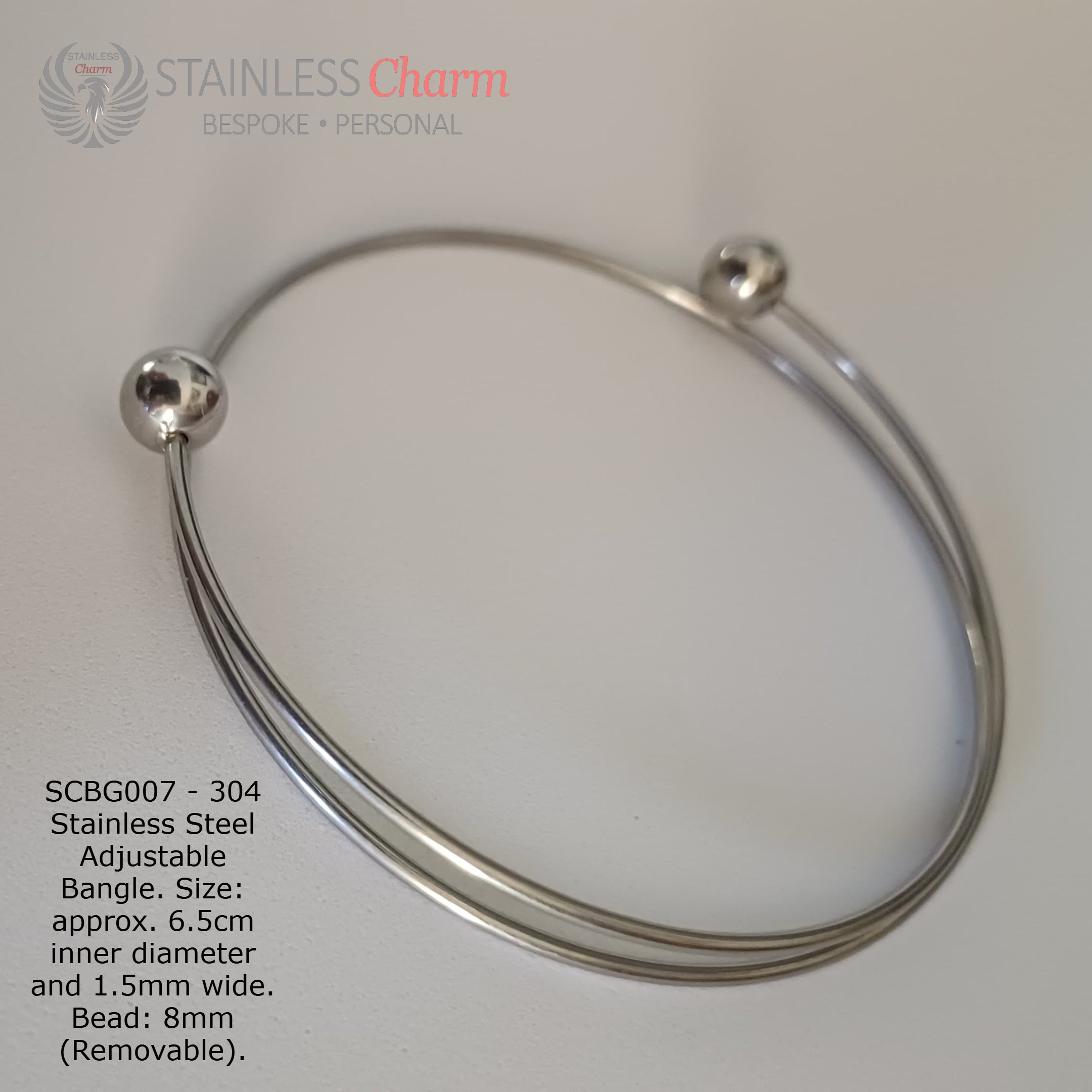 304 Stainless Steel Adjustable Bangle. Size: approx. 6.5cm inner diameter and 1.5mm wide. Bead: 8mm (Removable).