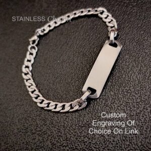 These bracelets are suitable for both teenagers and adults. They feature a rectangular link with a Cuban chunky curb chain. All metal parts are non-tarnish (Hypoallergenic) 201 or 304 stainless steel. Due to the size of the link, two-line engraving is preferred; however, we can provide alternative recommendations. Engraving can be done on both sides of the link.