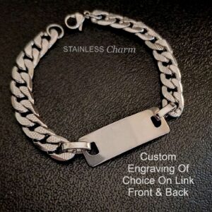 These bracelets are suitable for both teenagers and adults.Ā They feature a rectangular link with a chunky Cuban Curb chain with faceted links. All metal parts are non-tarnish (Hypoallergenic) 201 or 304 stainless steel. Due to the size of the link, 2 – 3 line engraving is preferred; however, we can provide alternative recommendations. Engraving can be done on both sides of the link.