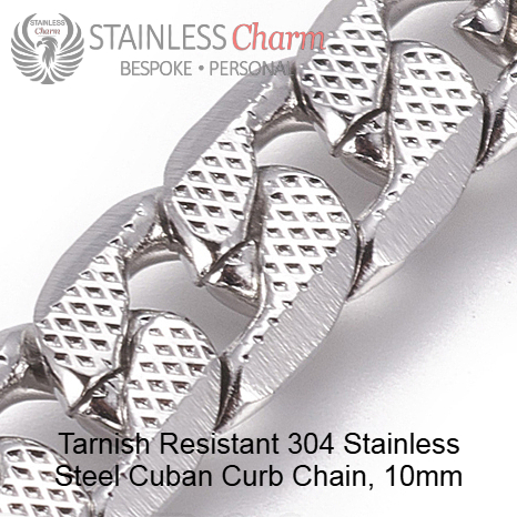 Tarnish-resistant 304 stainless steel link, Rectangle, Size: 41.5x14x1mm, Hole: 4×5.5mm, 304 stainless steel chunky Cuban Curb chain with textured links, 11mm. (SKU-SCBSS006)