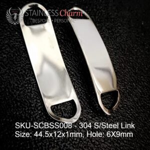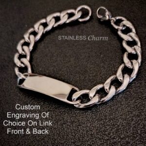 These bracelets are suitable for both teenagers and adults. They feature a rectangular link with a chunky Cuban Curb chain with faceted links. All metal parts are non-tarnish (Hypoallergenic) 201 or 304 stainless steel. Due to the size of the link, 2 – 3 line engraving is preferred; however, we can provide alternative recommendations. Engraving can be done on both sides of the link.