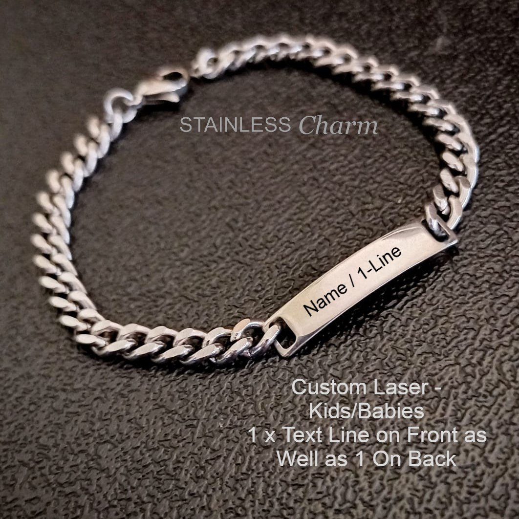 These bracelets are ideal for small children or babies. They feature a small oval link with an unwelded curb chain. All metal parts are non-tarnish (Hypoallergenic) 201 or 304 stainless steel. Due to the small link, only a one-line engraving can be on both the front and back.