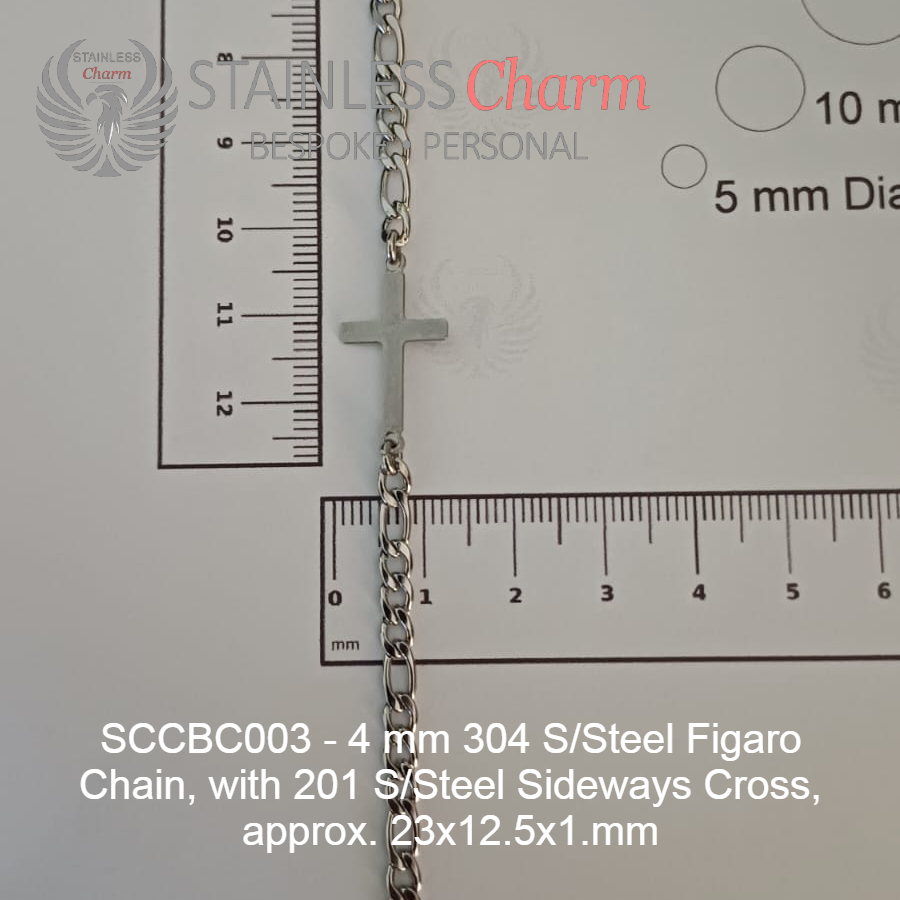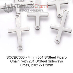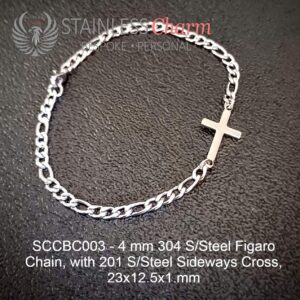 These bracelets feature a 201 stainless steel sideways cross (approx. 23×12.5×1.4mm) and a 304 stainless steel Figaro chain (4mm). (SKU-SCCBC003)