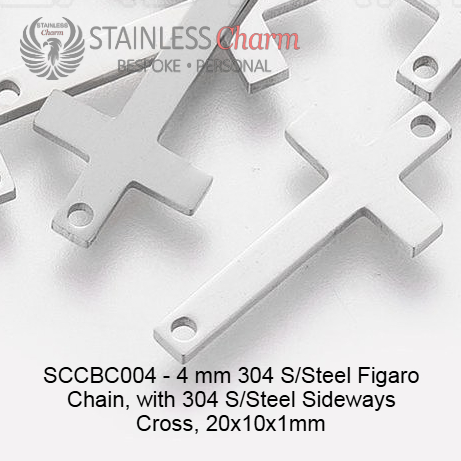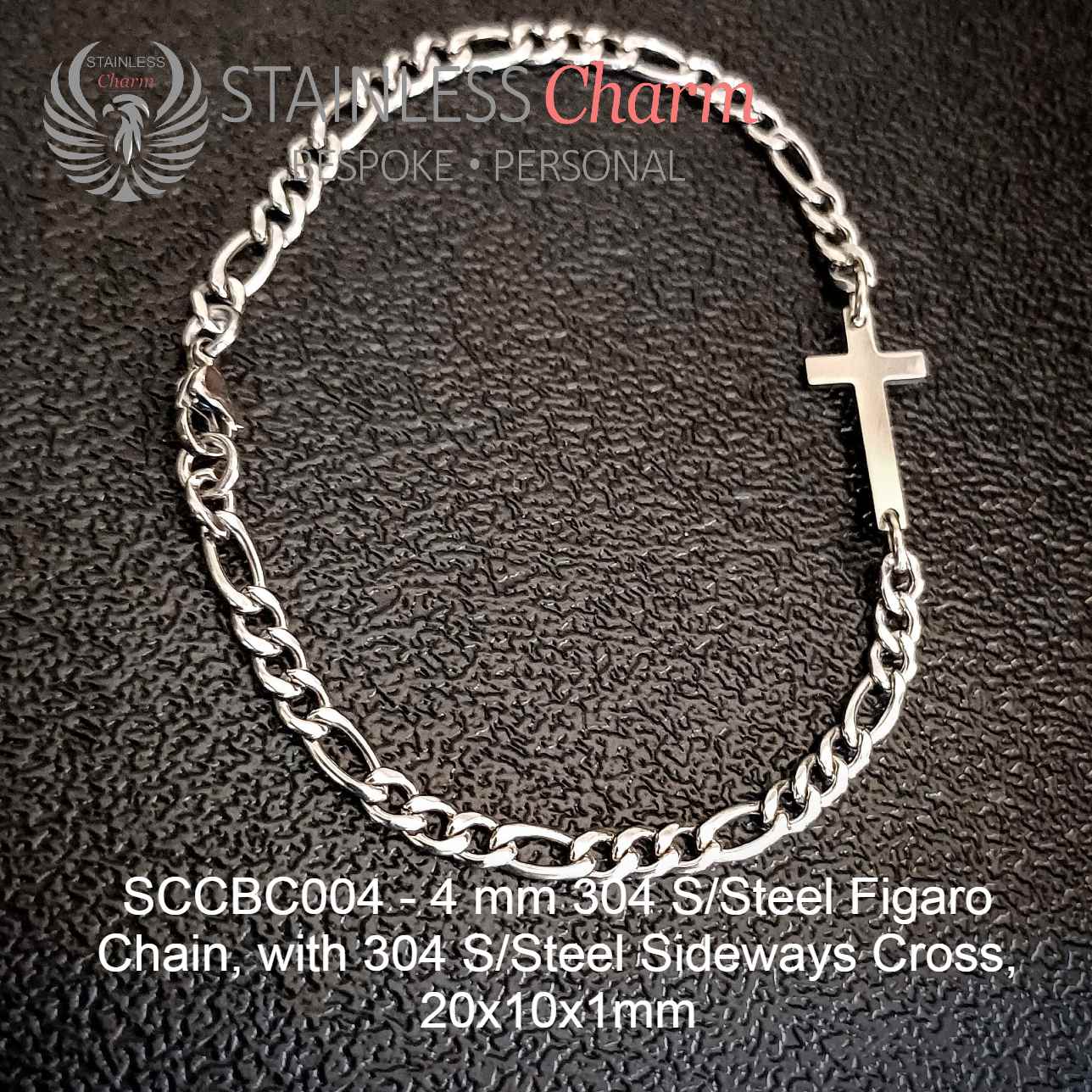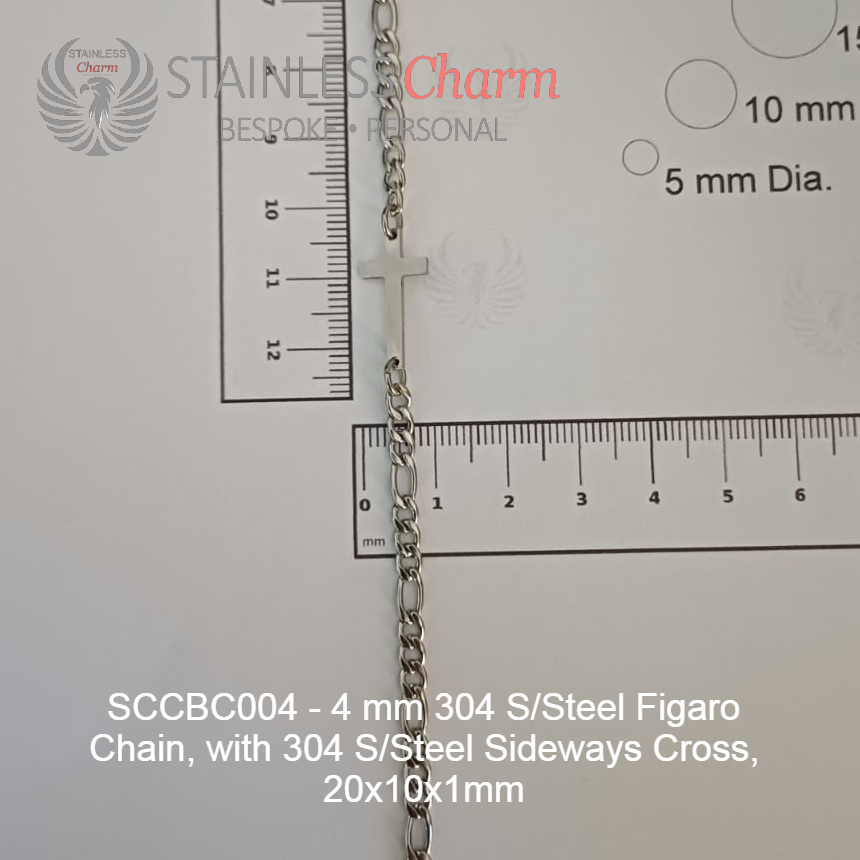 These bracelets feature a 304 stainless steel sideways cross (approx. 20x10x1mm) and a 304 stainless steel Figaro chain (4mm). (SKU-SCCBC004)