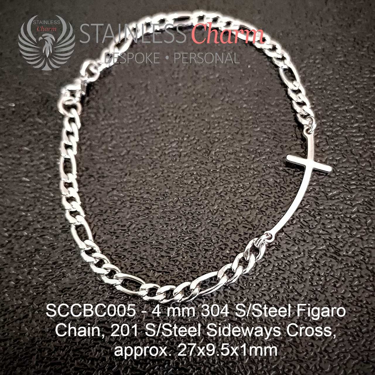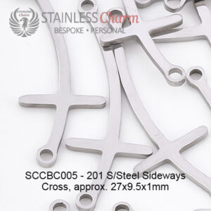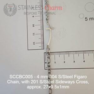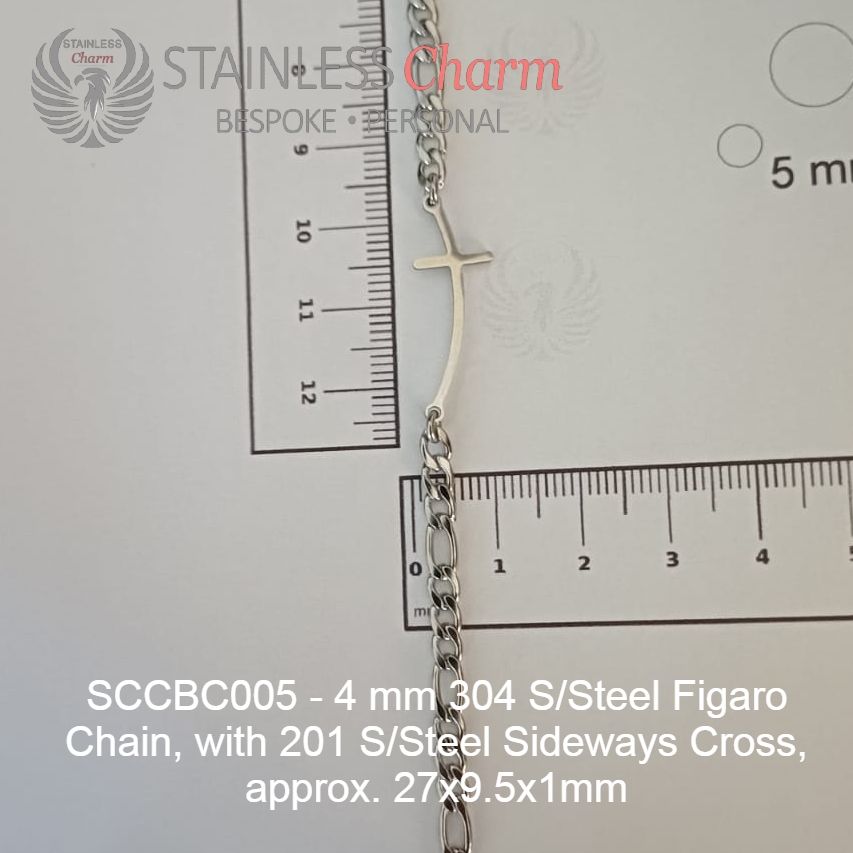 These bracelets feature a 201 stainless steel sideways cross (approx. 27×9.5x1mm) and a 304 stainless steel Figaro chain (4mm). (SKU-SCCBC005)
