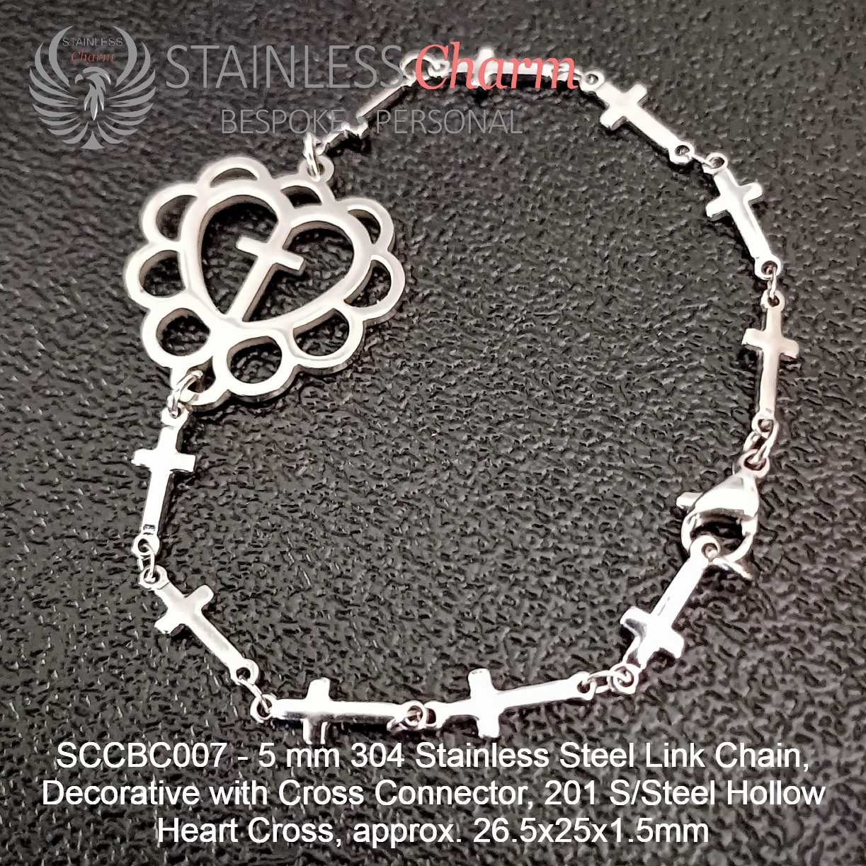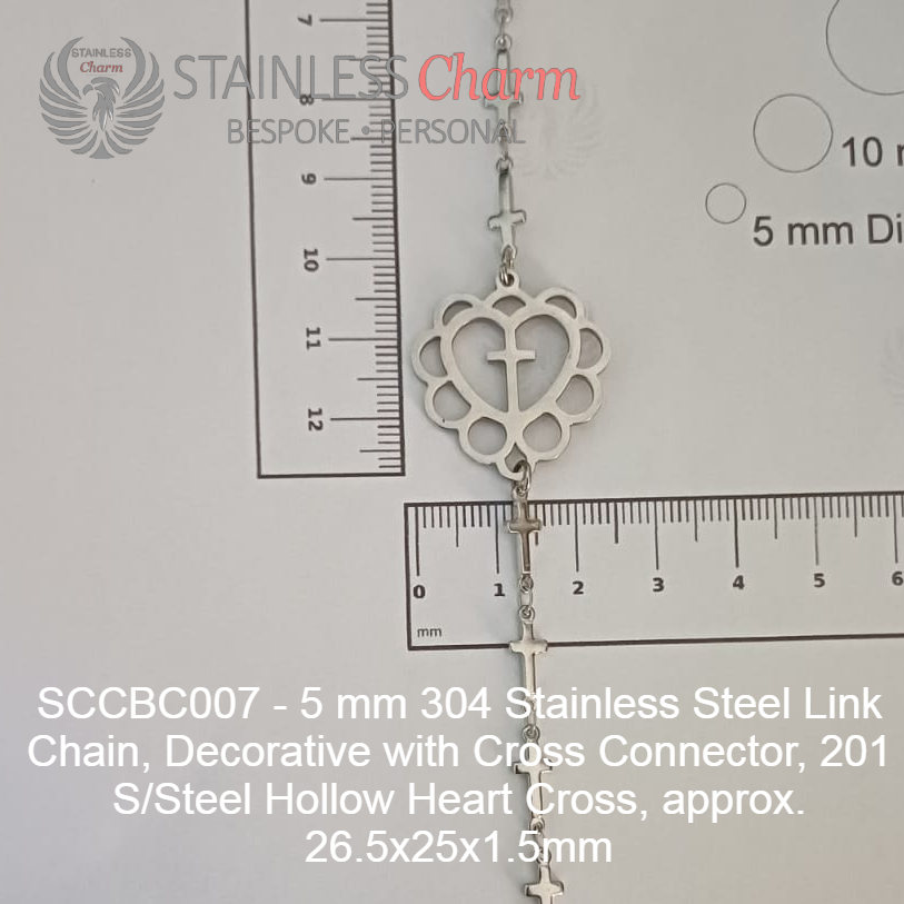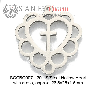 TheseĀ braceletsĀ haveĀ aĀ 304Ā stainlessĀ steelĀ chainĀ andĀ aĀ hollowĀ heartĀ withĀ crossĀ madeĀ ofĀ 201Ā stainlessĀ steel,Ā measuringĀ aboutĀ 26.5x25x1.5Ā mm. CrossĀ connectorsĀ areĀ decorativeĀ (4mm). (SKU:Ā SCCBC007)