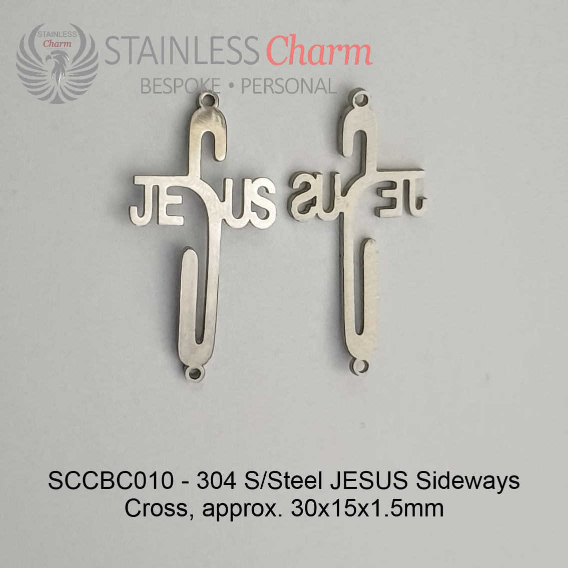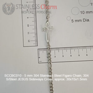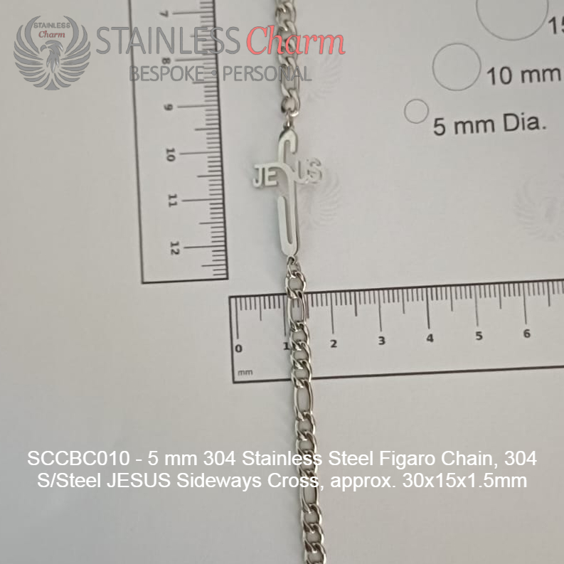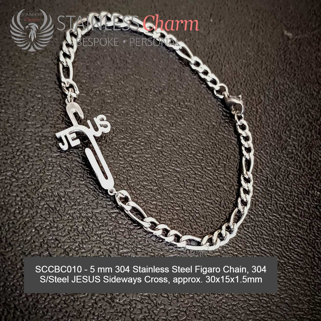 These bracelets feature a 304 stainless steel Figaro chain (5mm) and a sideways JESUS cross made of 304 stainless steel, measuring approximately 30x15x1.5mm. (SKU: SCCBC010)