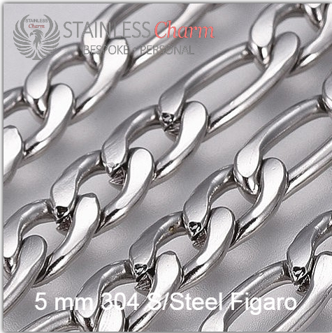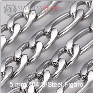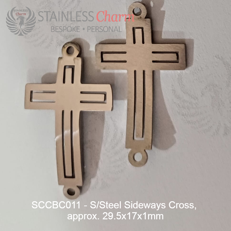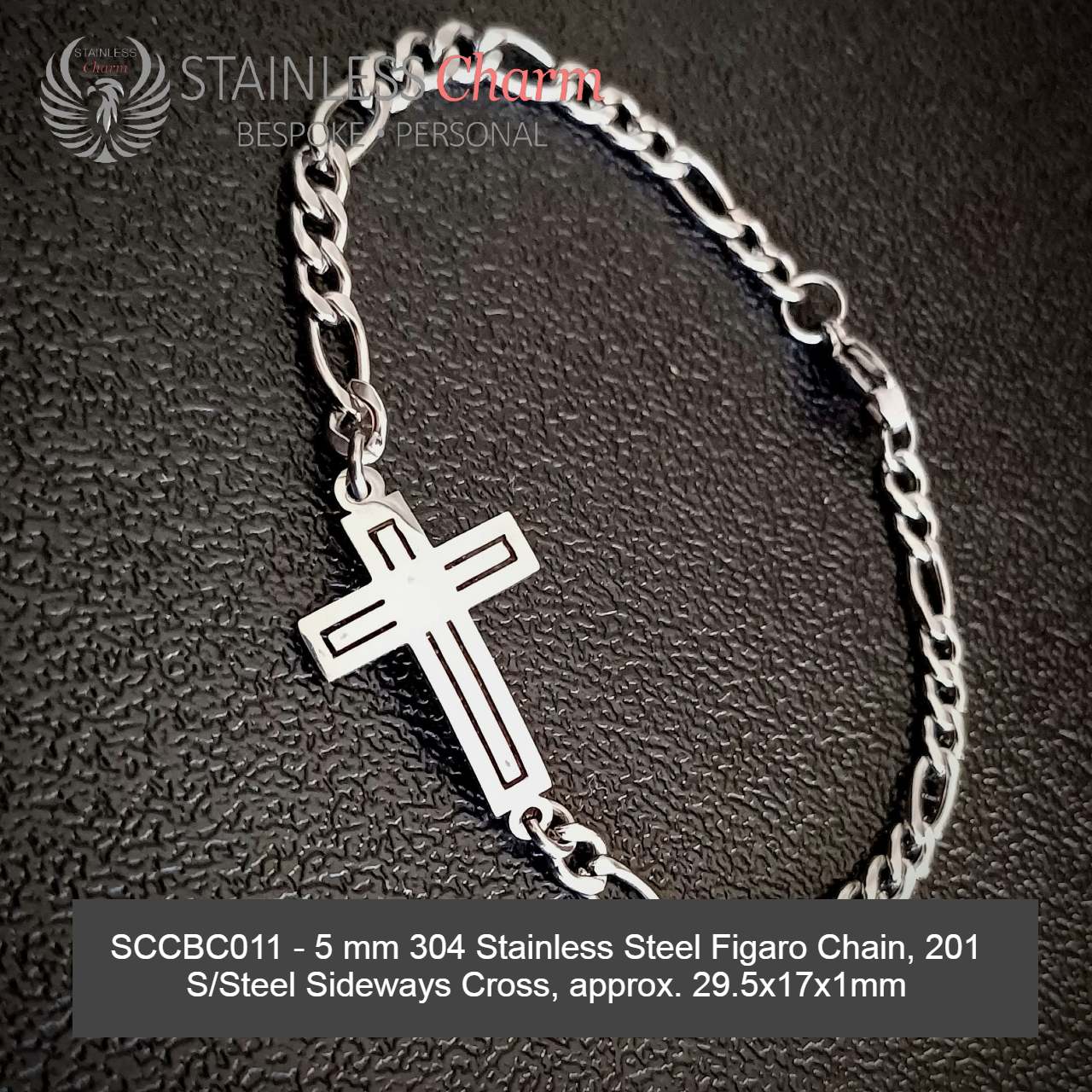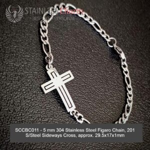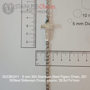 These bracelets feature a 304 stainless steel Figaro chain (5mm) and a sideways cross made of 201 stainless steel, measuring approximately 29.5x17x1mm. (SKU: SCCBC011)