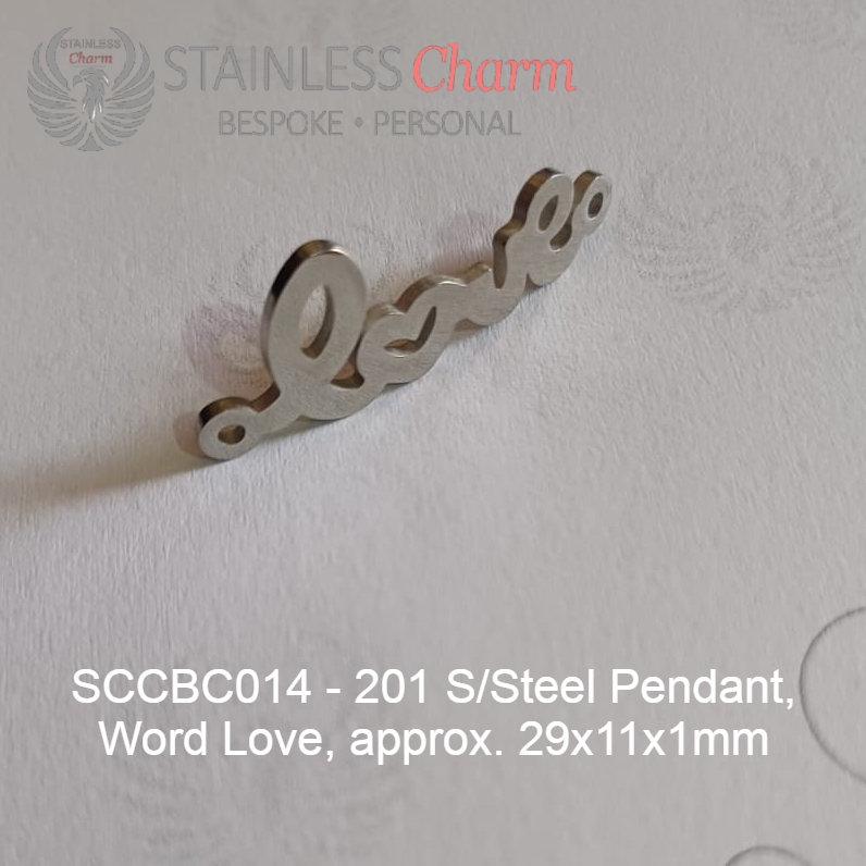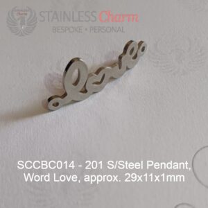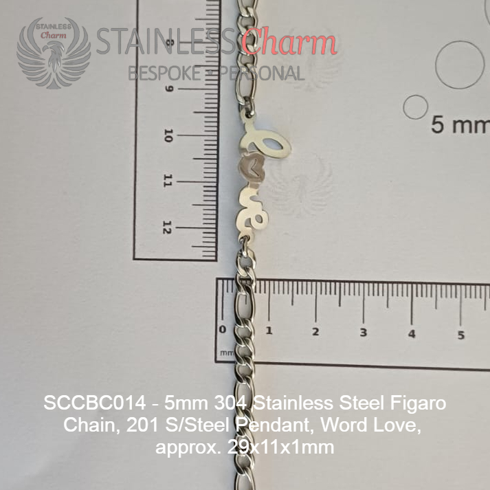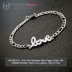These bracelets feature a 304 stainless steel Figaro chain (5mm) and a Word Love pendant made of 201 stainless steel, measuring approximately 29x11x1mm. (SKU: SCCBC014)
