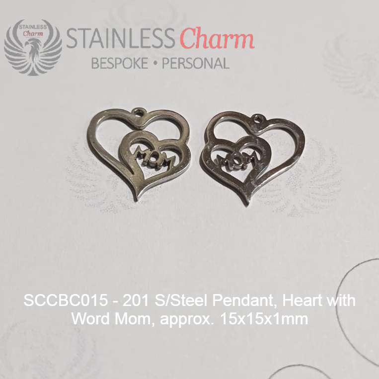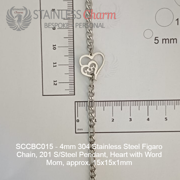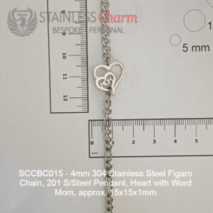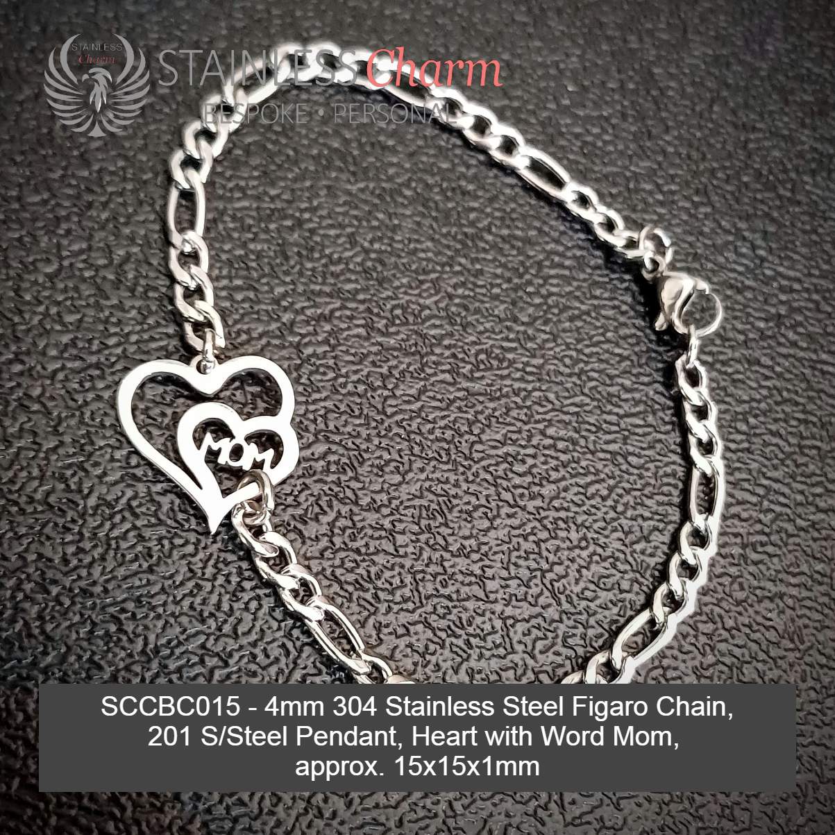 These bracelets feature a 304 stainless steel Figaro chain (4mm) and a Heart with Word Mom pendant made of 201 stainless steel, measuring approximately 15x15x1mm. (SKU: SCCBC015)