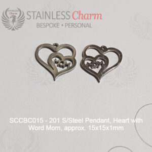 201 Stainless Steel Pendant, Heart with Word Mom, approx. 15x15x1mm