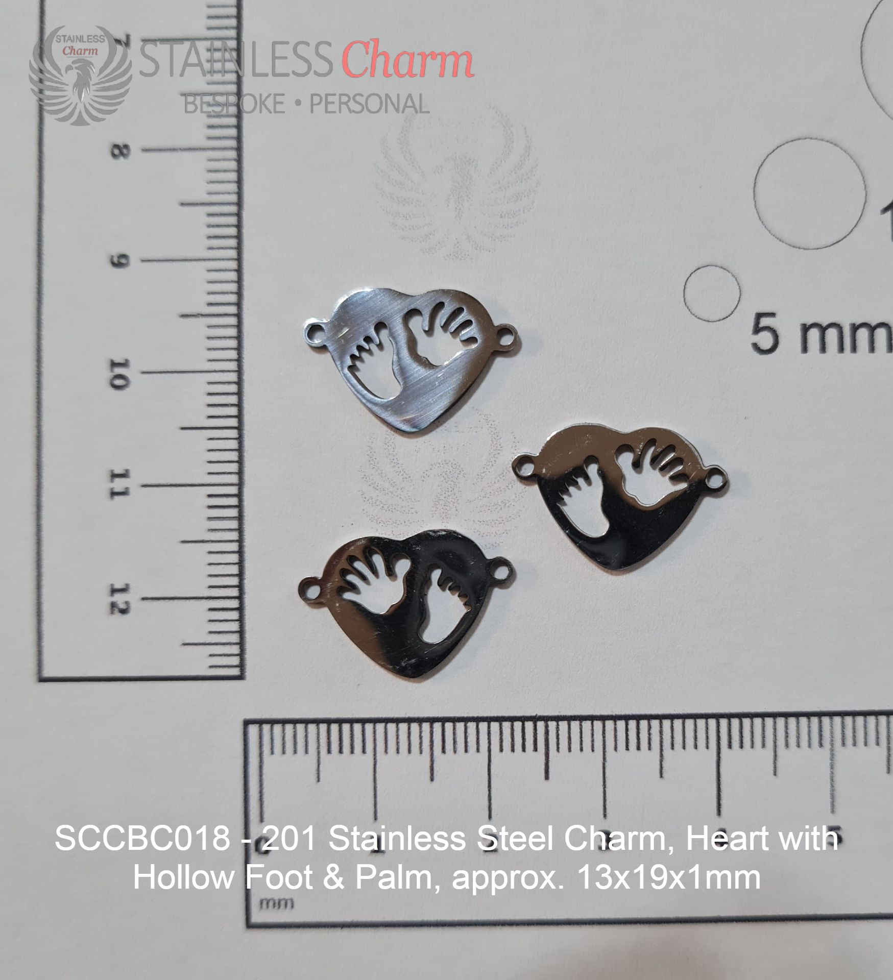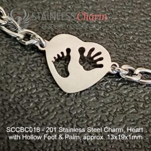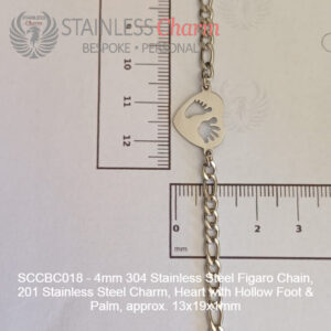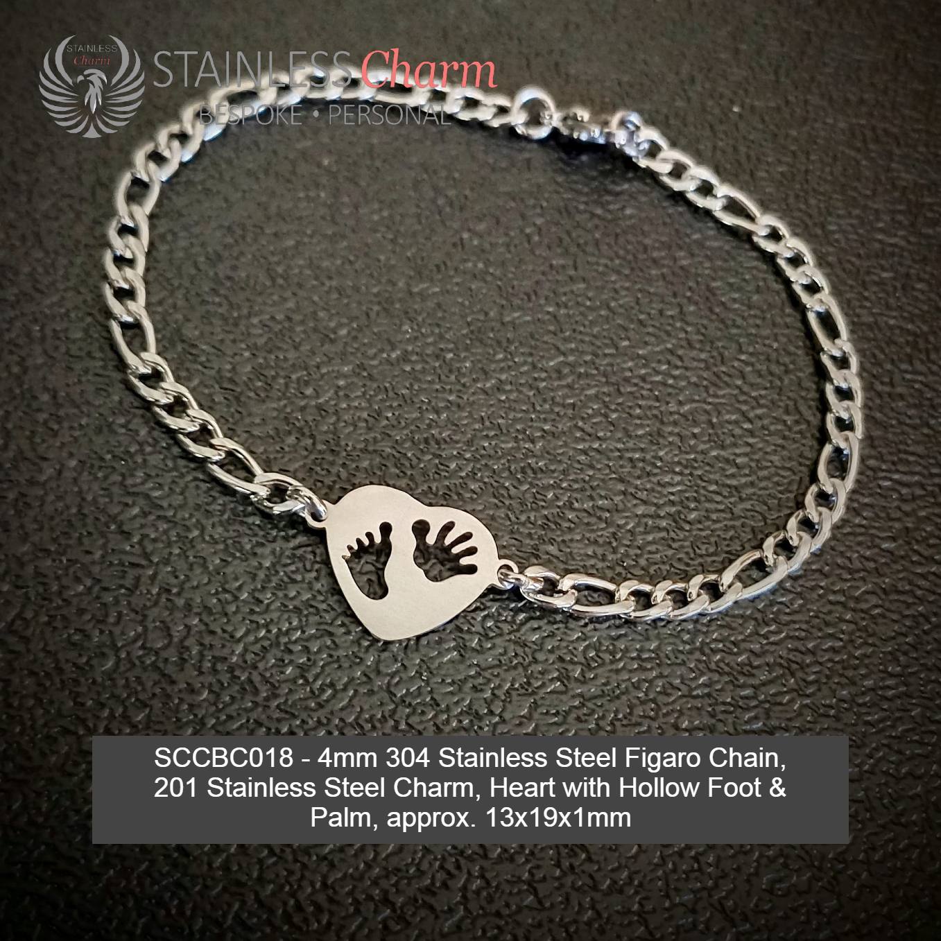 These bracelets feature a 304 stainless steel Figaro chain (4mm) and a Heart with Hollow Foot & Palm pendant made of 201 stainless steel, measuring approximately 13x19x1mm. (SKU: SCCBC018)