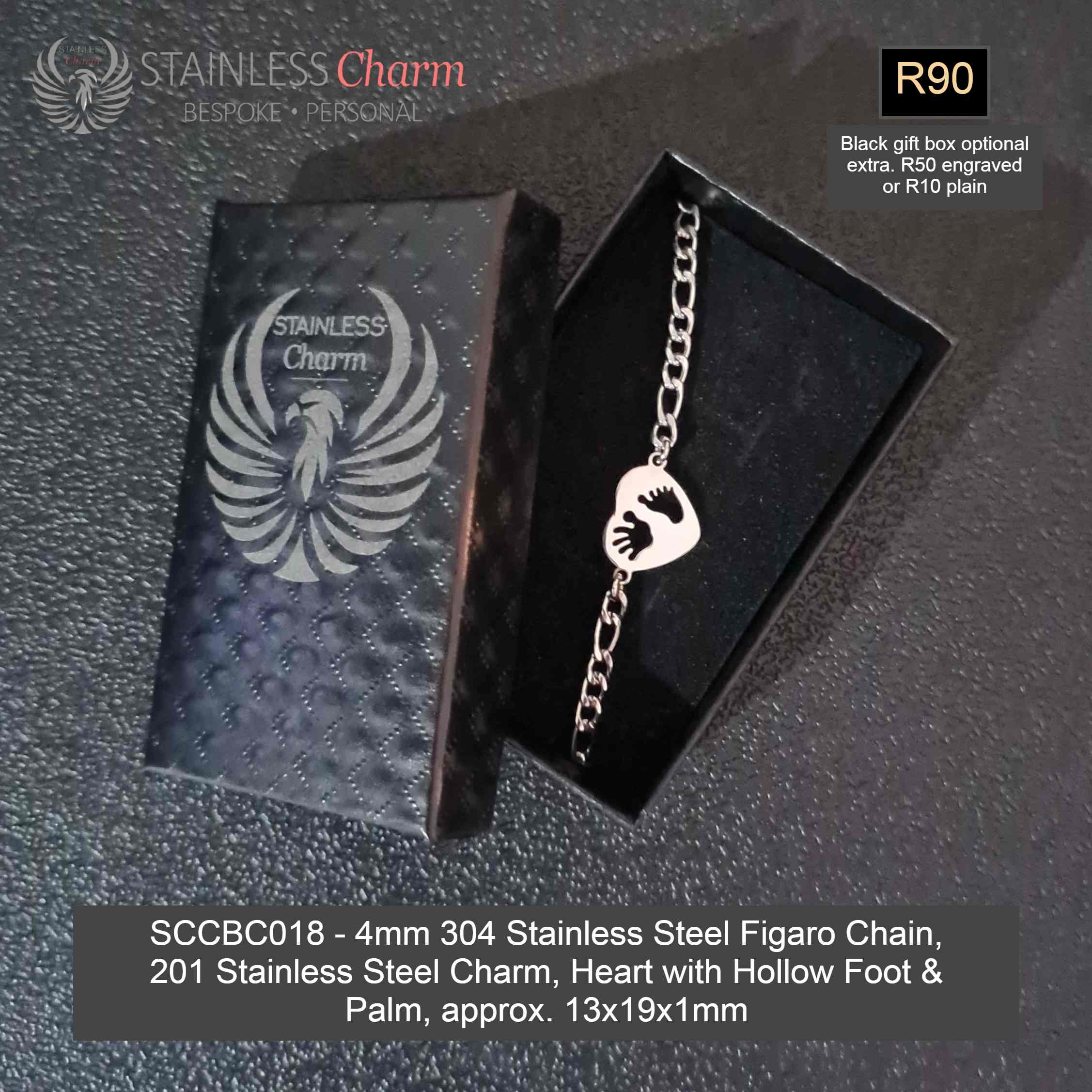 4mm 304 Stainless Steel Figaro Chain, 201 Stainless Steel Charm, Heart with Hollow Foot & Palm, approx. 13x19x1mm. (Note: The engraved black gift box costs an additional R50 and is an optional item. We may engrave the recipient’s information and a date on the box if you’d like. For R10, you can also purchase the present box without engraving. Kindly provide the option you chose in the order comment.)
