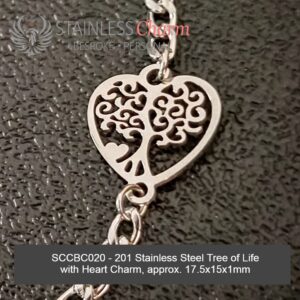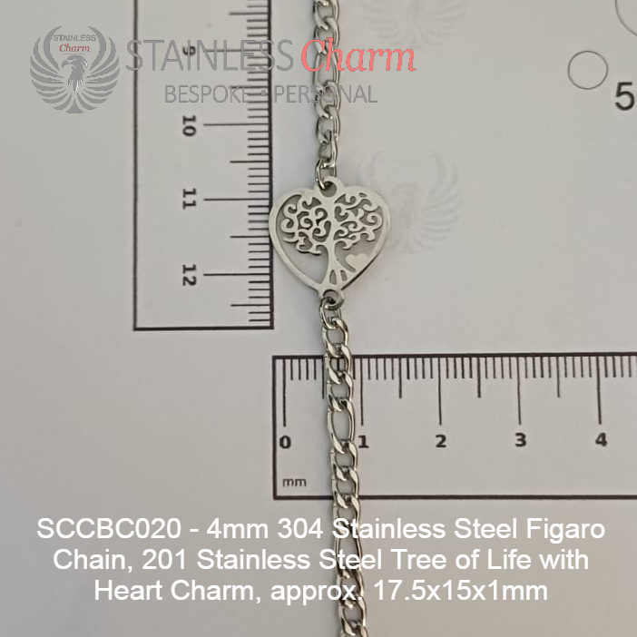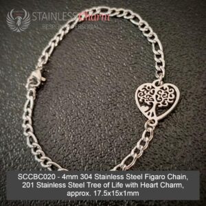 These bracelets feature a 304 stainless steel Figaro chain (4mm) and a Tree of Life with Heart charm made of 201 stainless steel, measuring approximately 17.5x15x1mm. (SKU: SCCBC020)