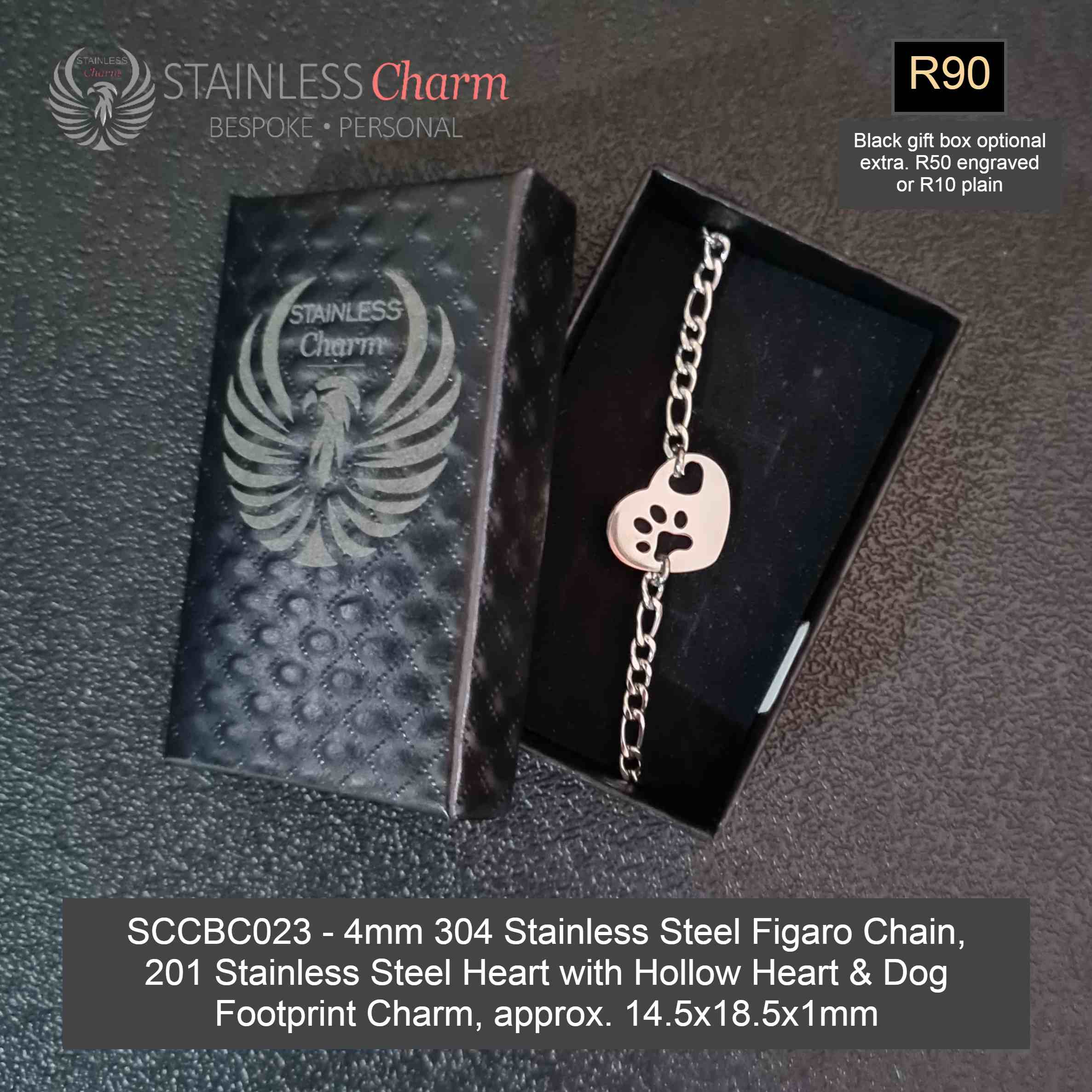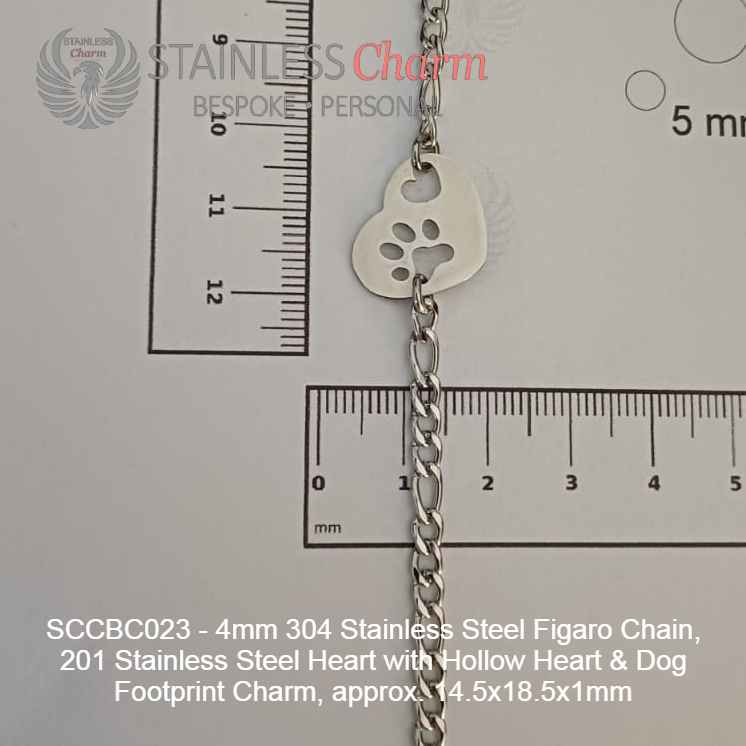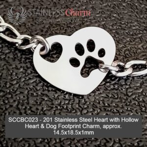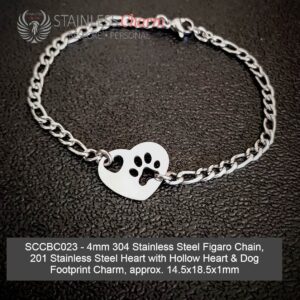 These bracelets feature a 304 stainless steel Figaro chain (4mm) and a Heart with Hollow Heart & Dog Footprint charm made of 201 stainless steel, measuring approximately 14.5×18.5x1mm. (SKU: SCCBC023)