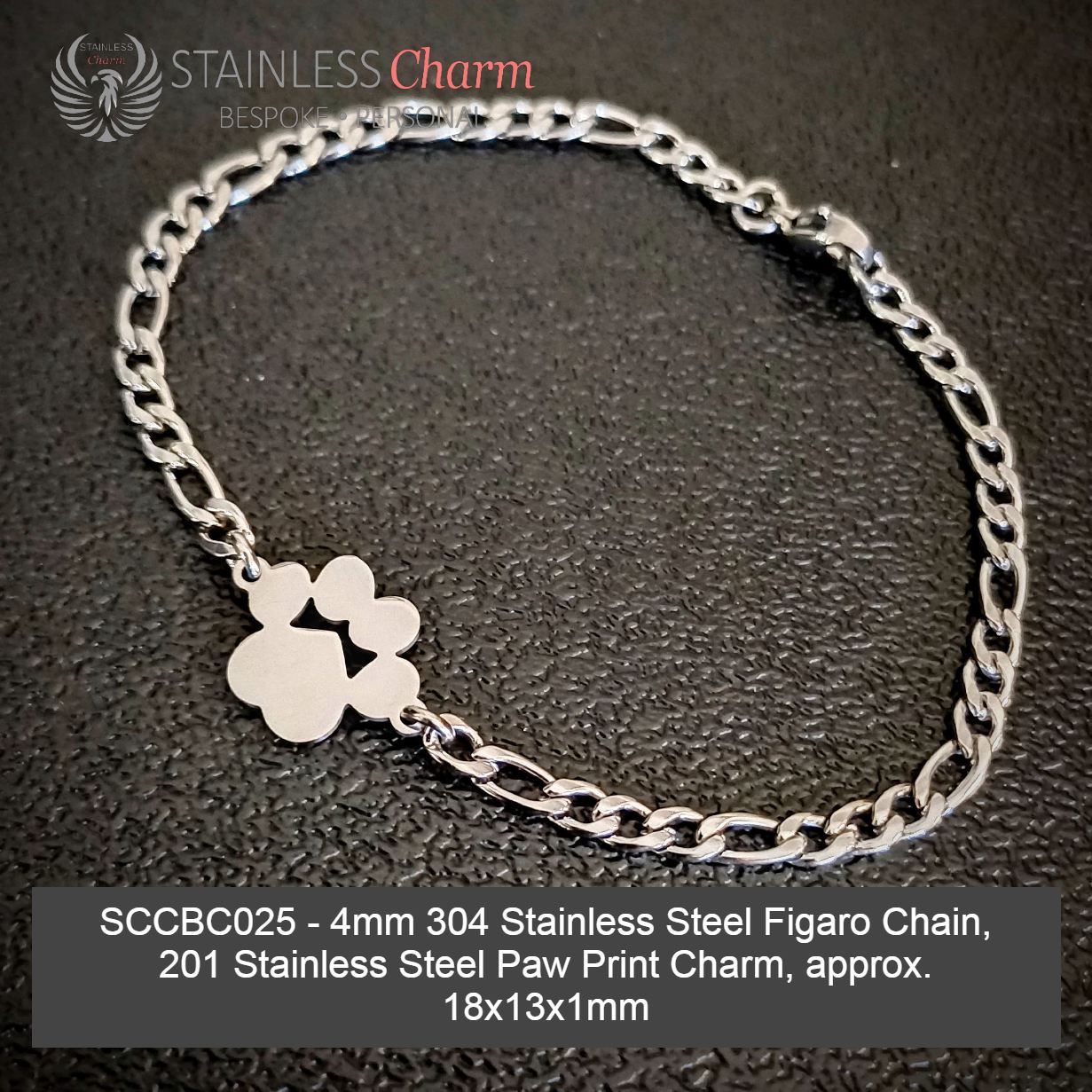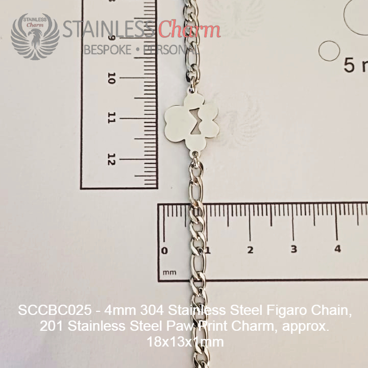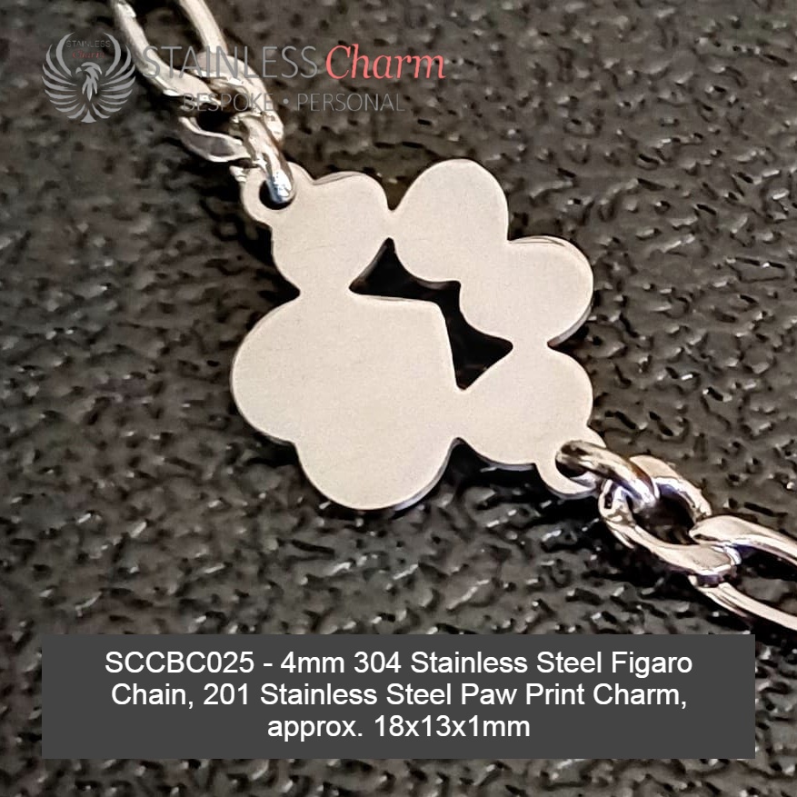 These bracelets feature a 304 stainless steel Figaro chain (4mm) and a Paw Print charm made of 201 stainless steel, measuring approximately 18x13x1mm. (SKU: SCCBC025)