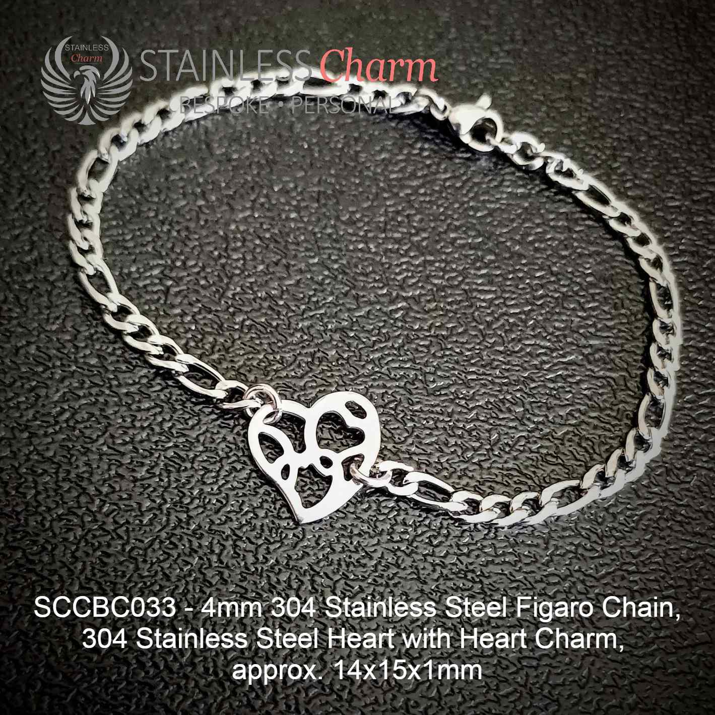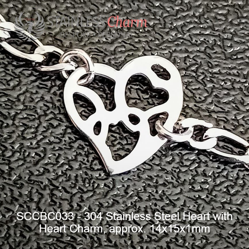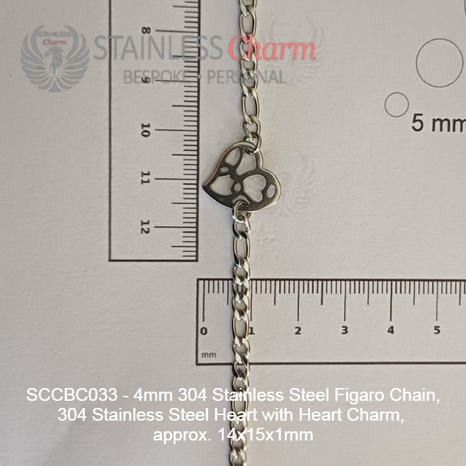 These bracelets feature a 304 stainless steel Figaro chain (4mm) and a Heart with Heart charm made of 304 stainless steel, measuring approximately 14x15x1mm. (SKU: SCCBC033)