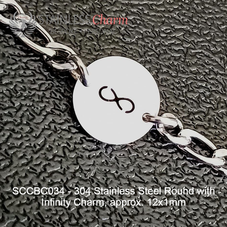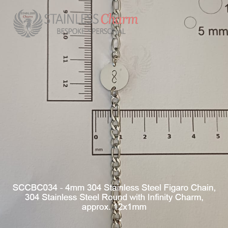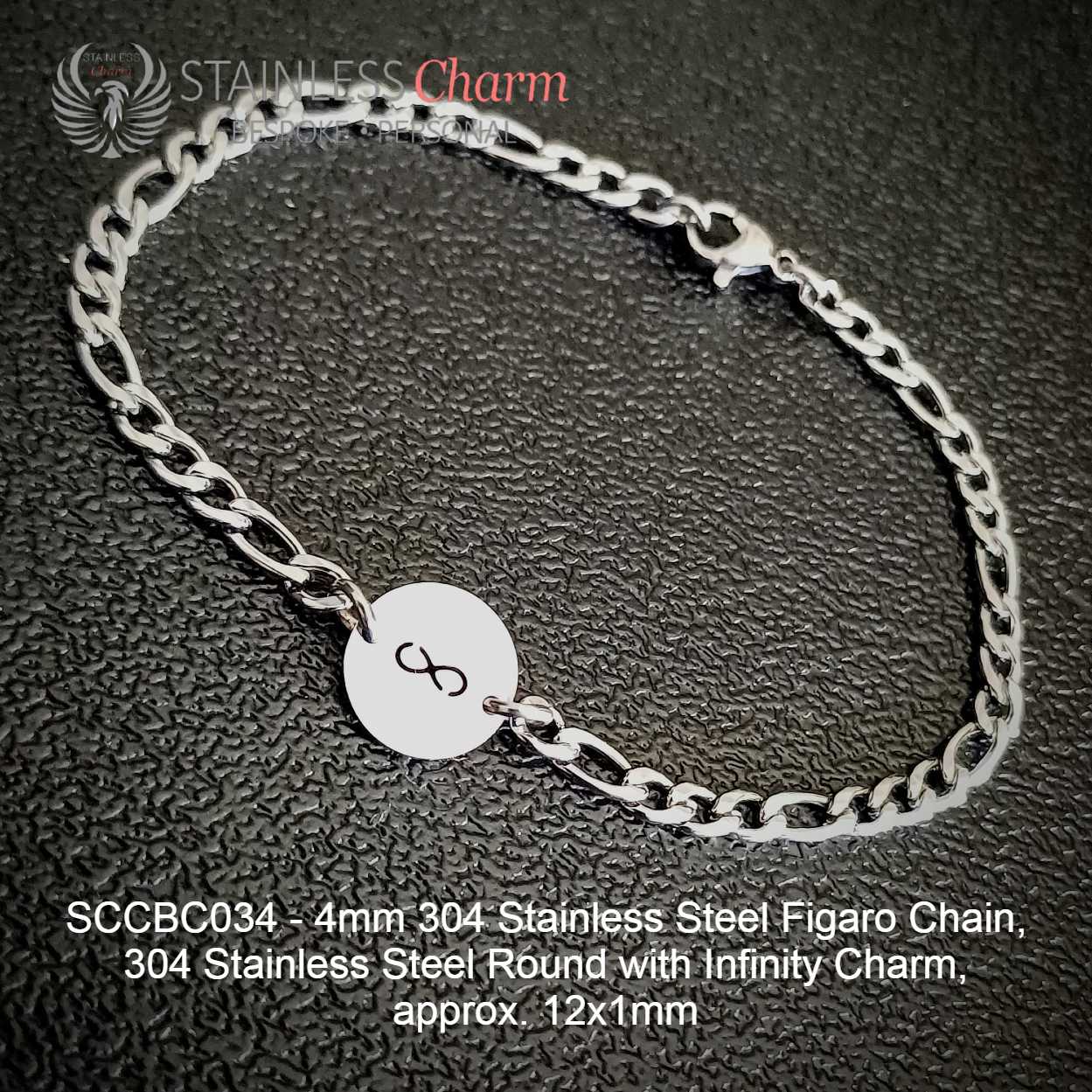 These bracelets feature a 304 stainless steel Figaro chain (4mm) and a Round with Infinity charm made of 304 stainless steel, measuring approximately 12x1mm. (SKU: SCCBC034)