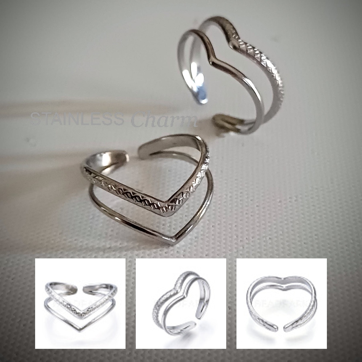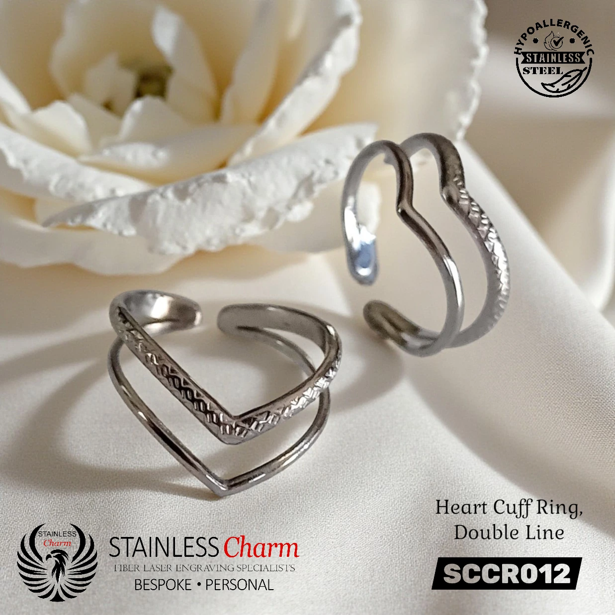 Non-Tarnish 304 Stainless Steel Heart Open Cuff Ring, Double Line