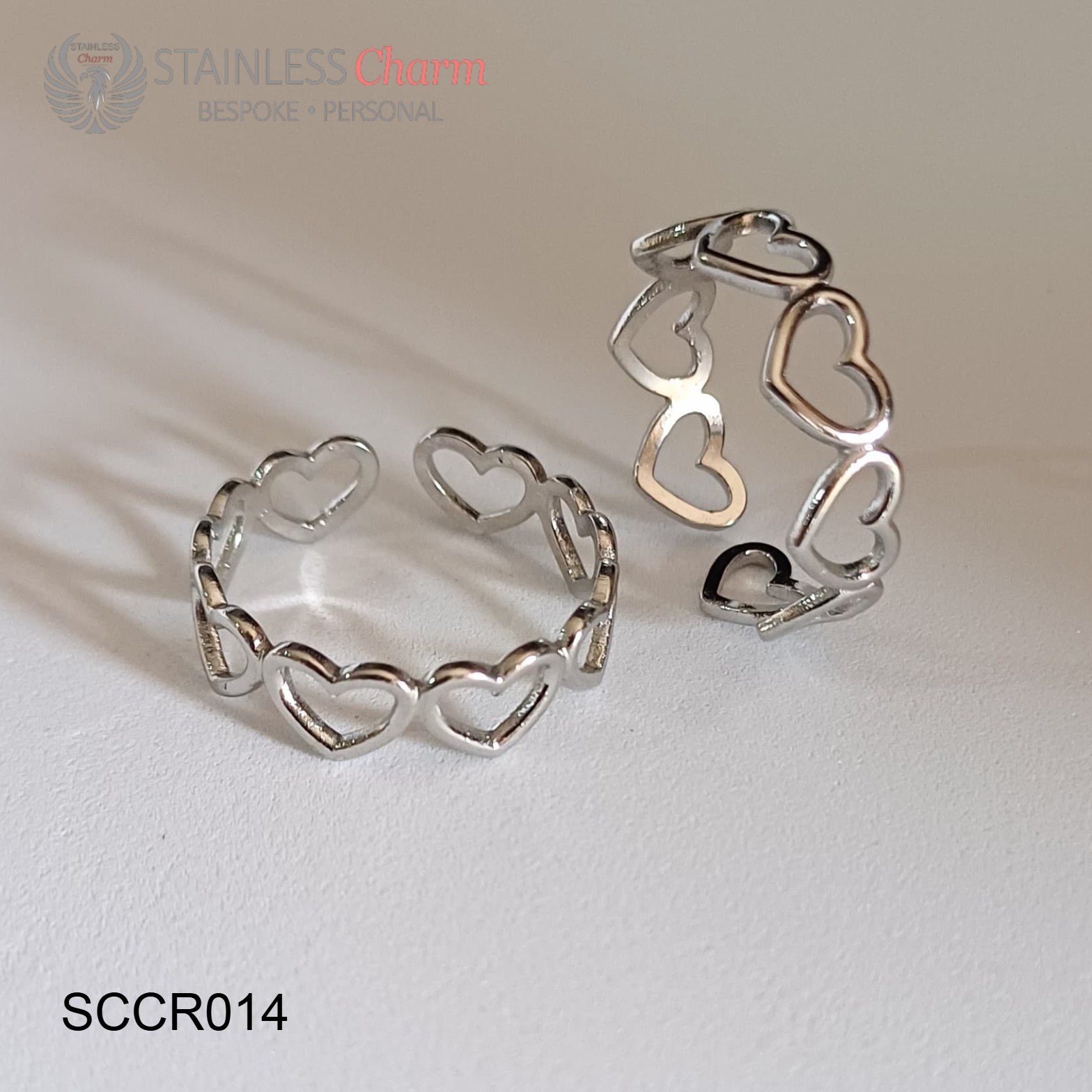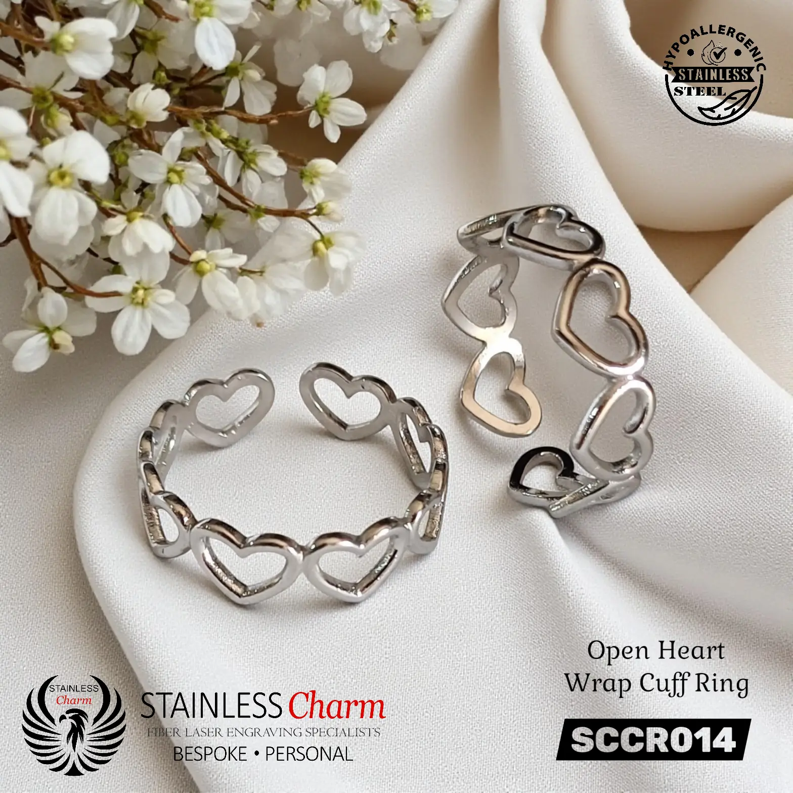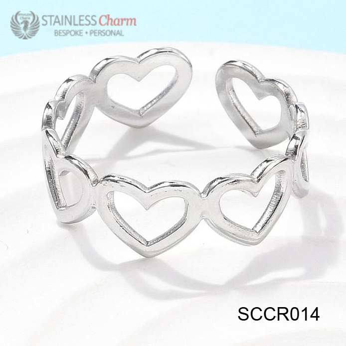 304 Stainless Steel Open Heart Wrap Cuff Ring for Women. Size: approx. 19.5mm inner diameter, 6mm wide.