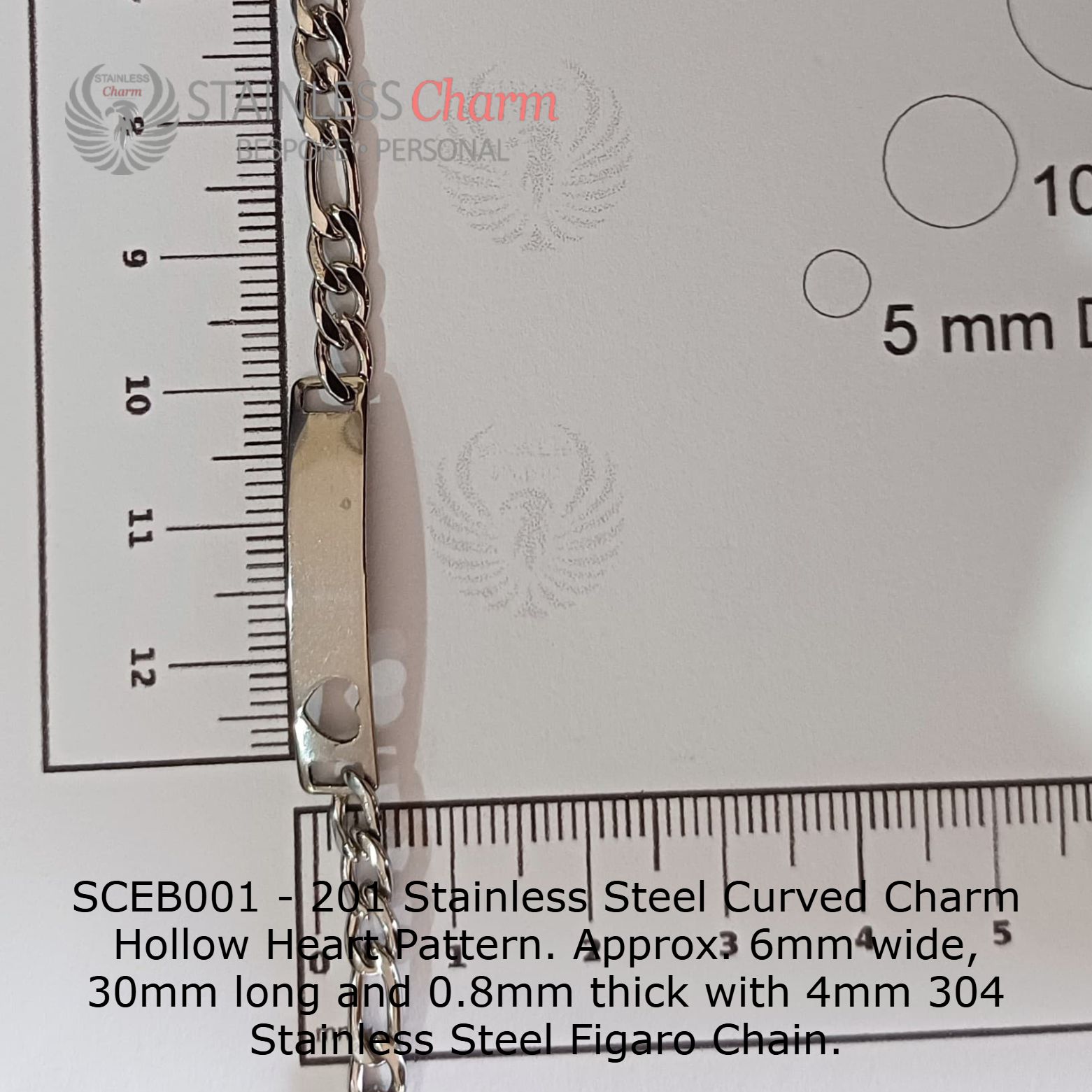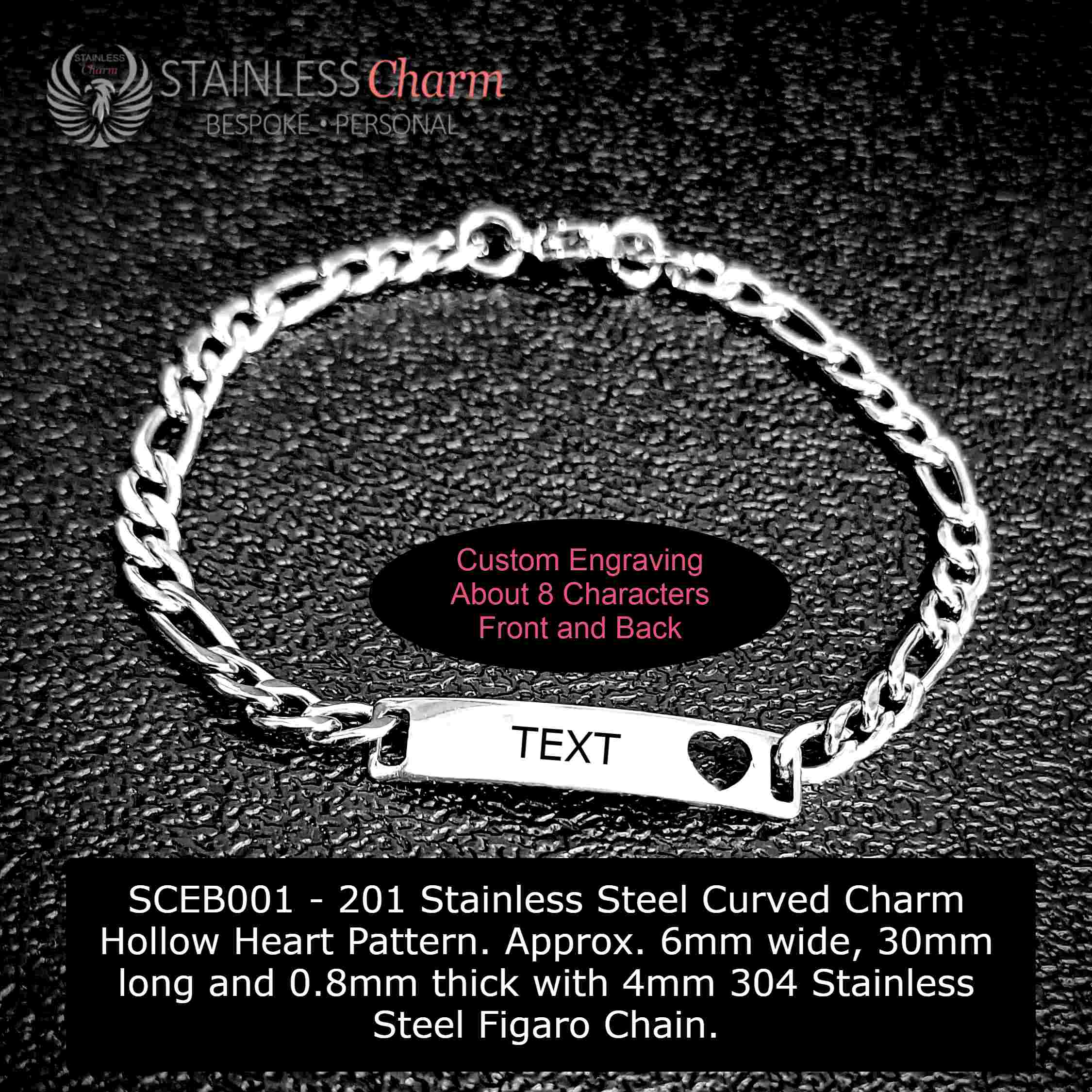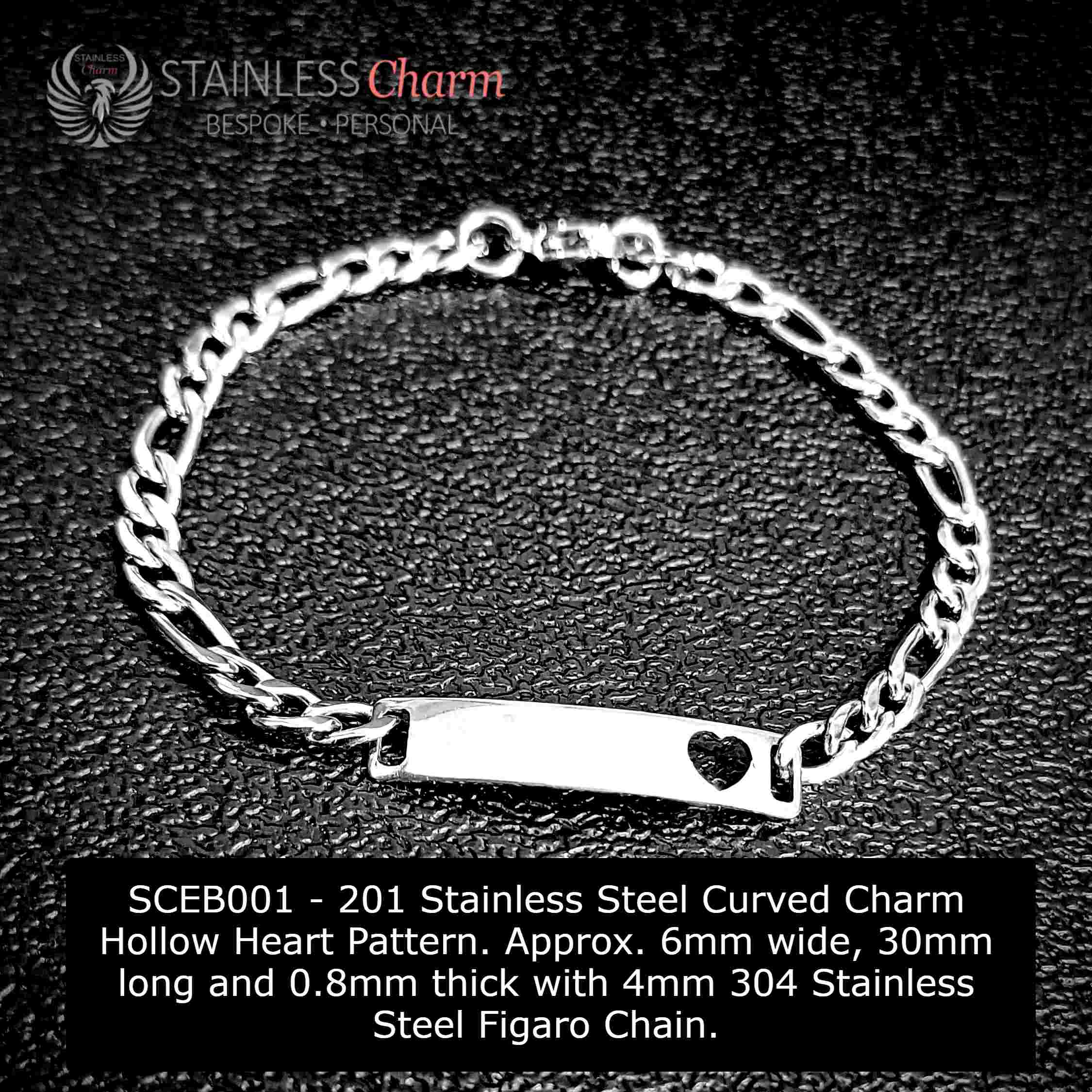 201 Stainless Steel Curved Charm Hollow Heart Pattern. Approx. 6mm wide, 30mm long and 0.8mm thick with 4mm 304 Stainless Steel Figaro Chain. (SKU-SCEB001)