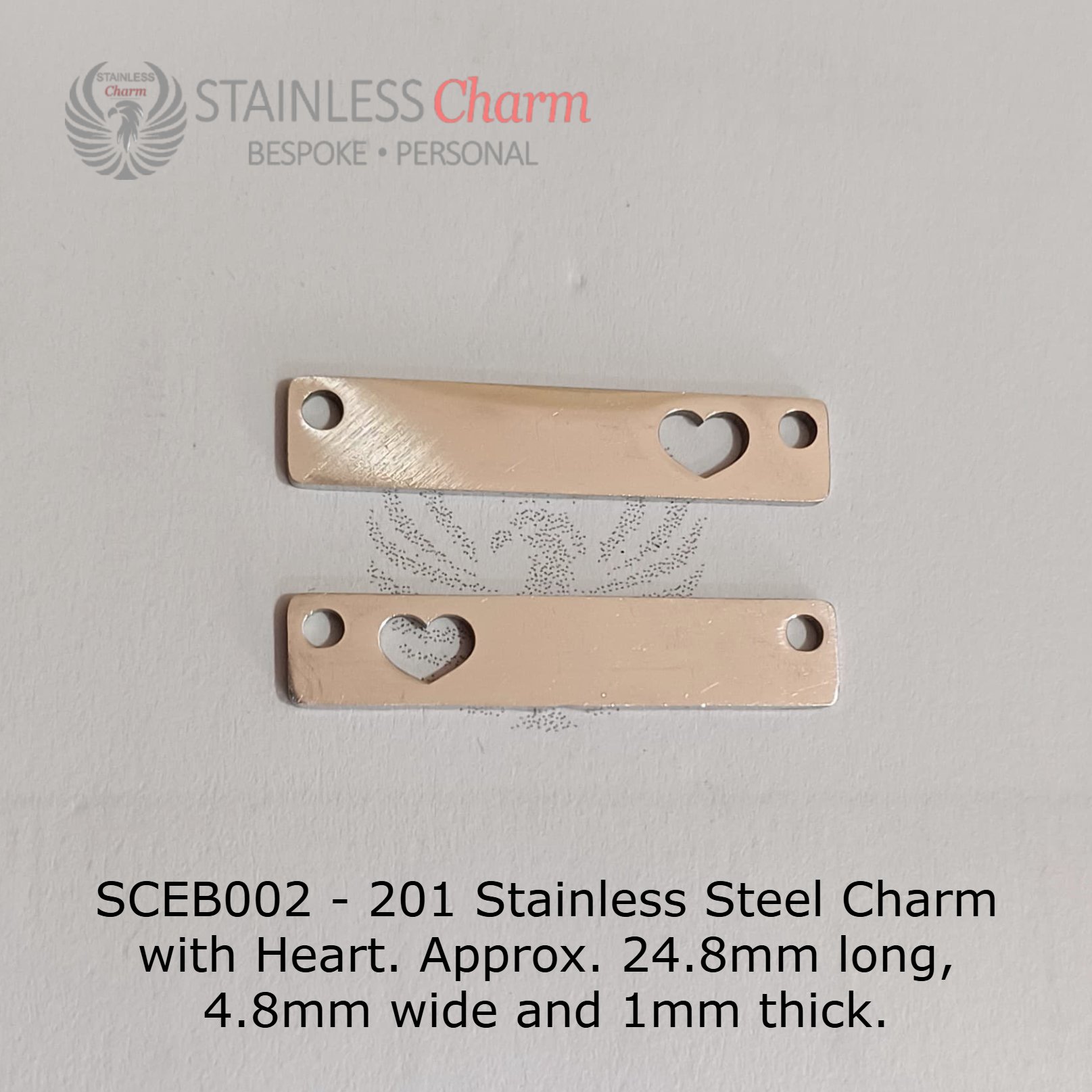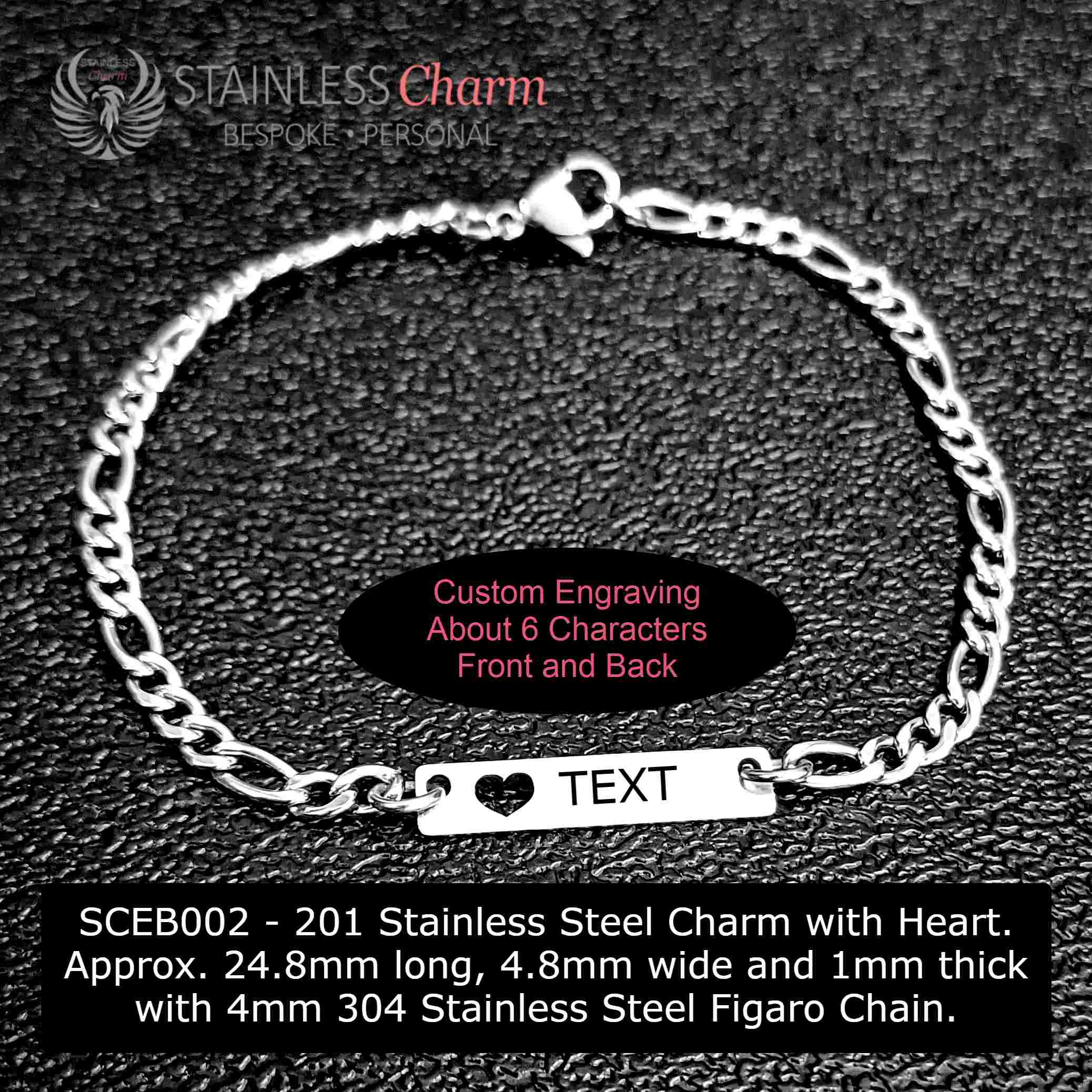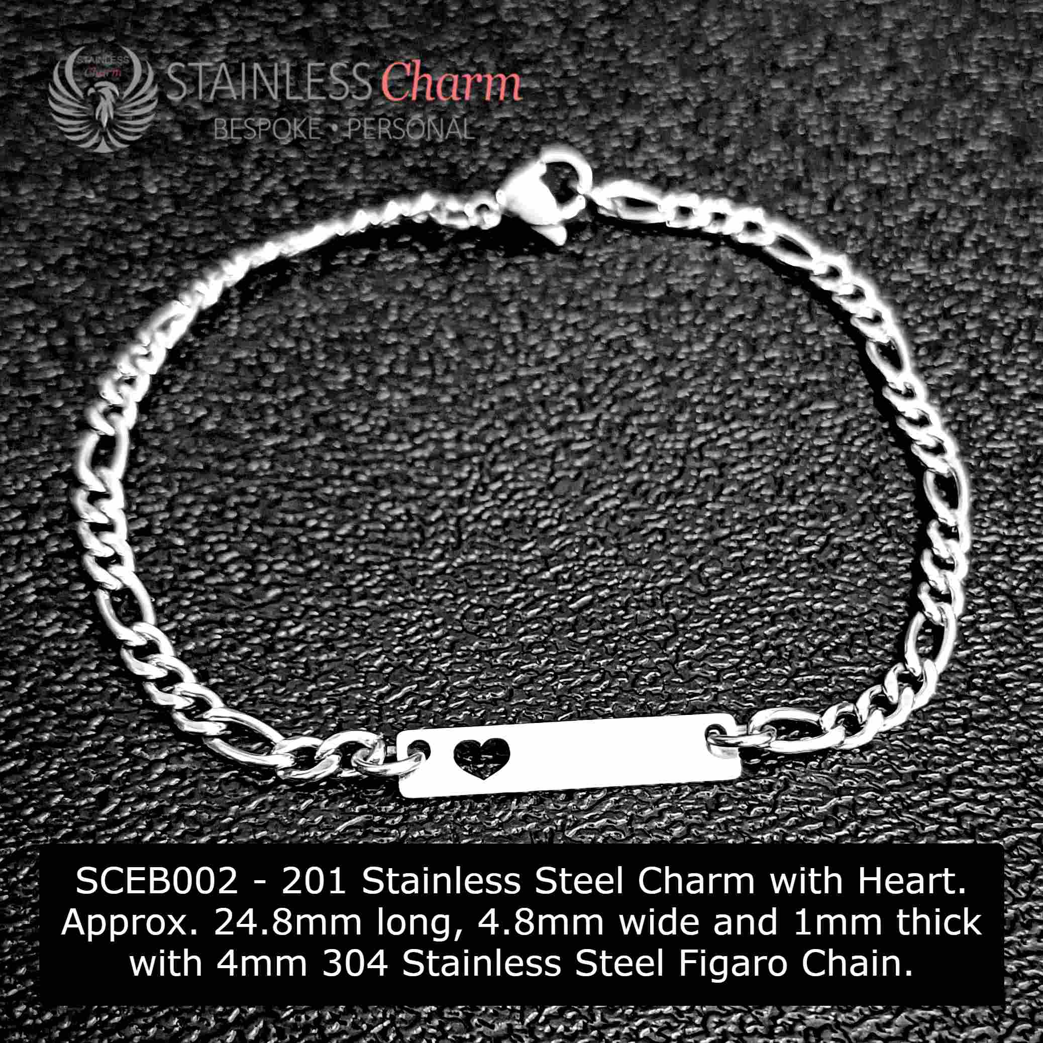 201 Stainless Steel Charm with Heart. Approx. 24.8mm long, 4.8mm wide and 1mm thick with 4mm 304 Stainless Steel Figaro Chain. (SKU-SCEB002)