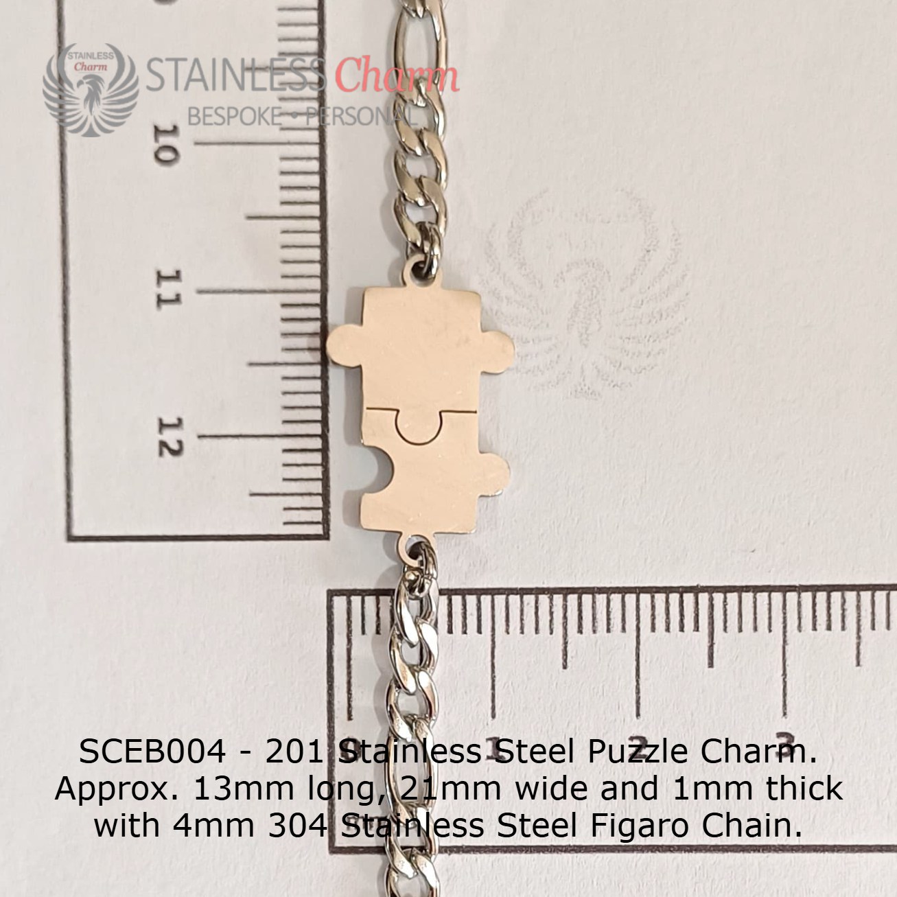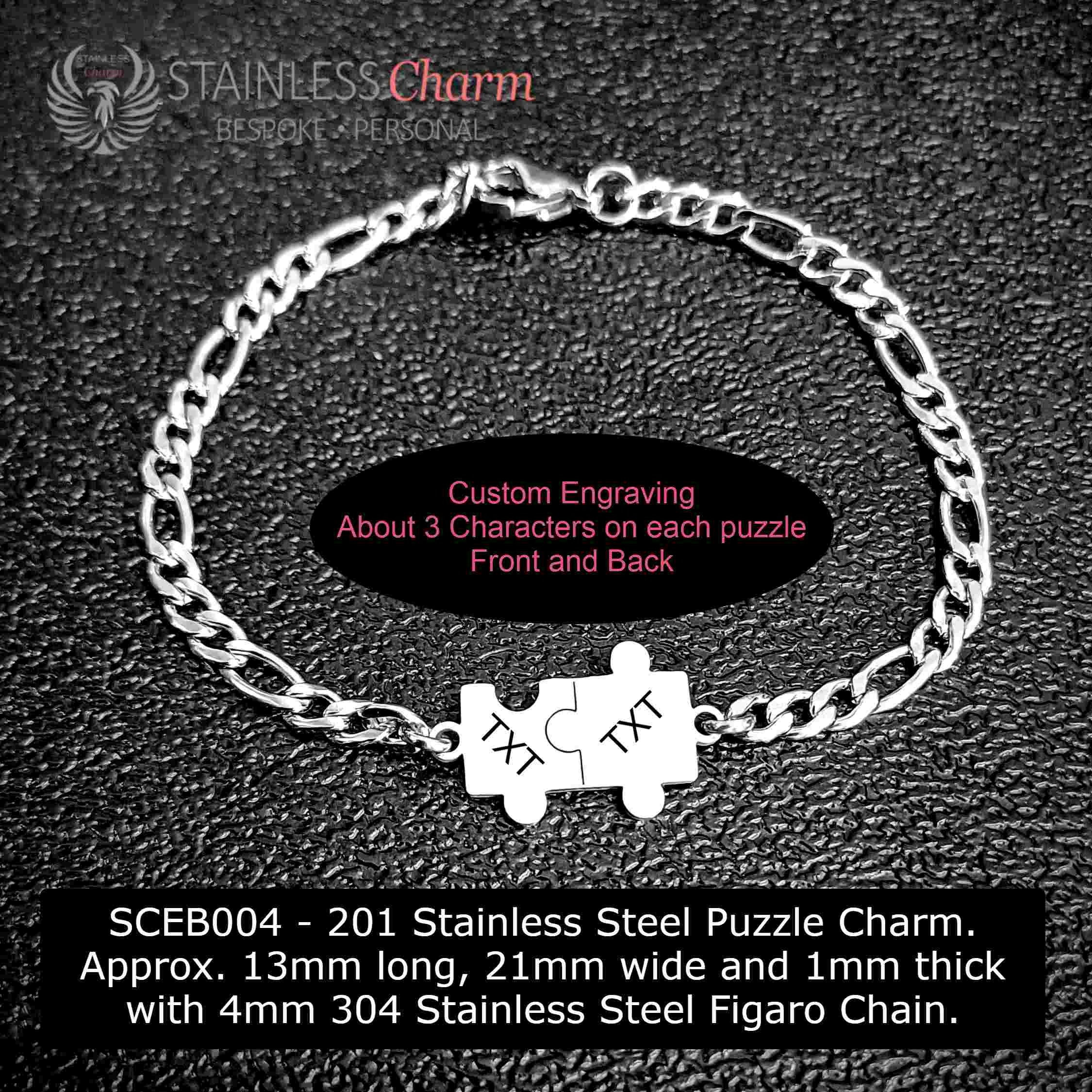 201 Stainless Steel Puzzle Charm. Approx. 13mm long, 21mm wide and 1mm thick with 4mm 304 Stainless Steel Figaro Chain. (SKU-SCEB004)