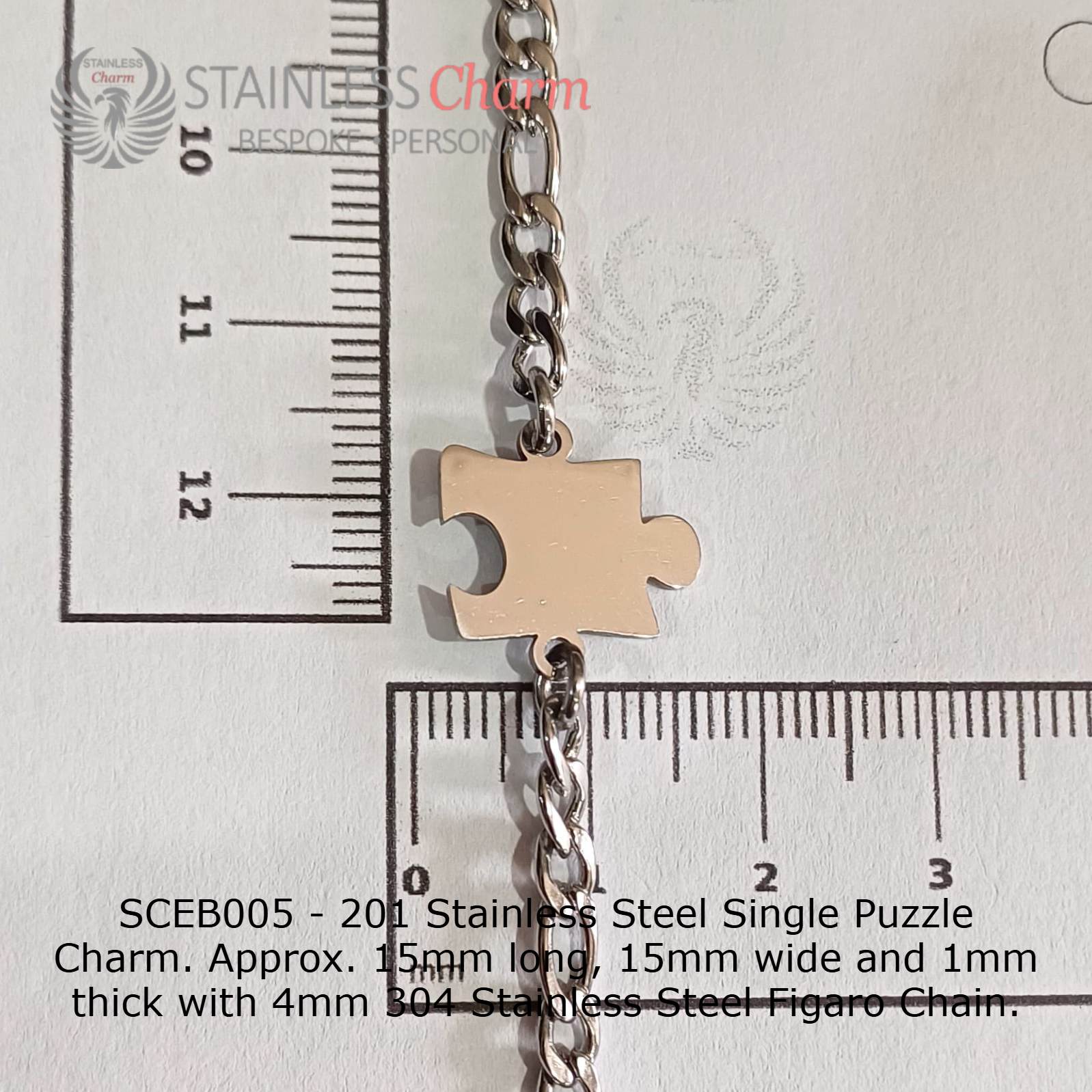 201 Stainless Steel Single Puzzle Charm. Approx. 15mm long, 15mm wide and 1mm thick with 4mm 304 Stainless Steel Figaro Chain. (SKU-SCEB005)