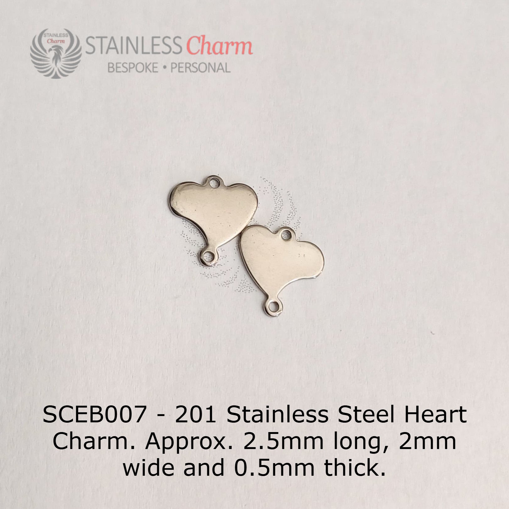 201 Stainless Steel Heart Charm. Approx. 2.5mm long, 2mm wide and 0.5mm thick with 2mm 304 Stainless Steel Cable Chain. (SKU-SCEB007)