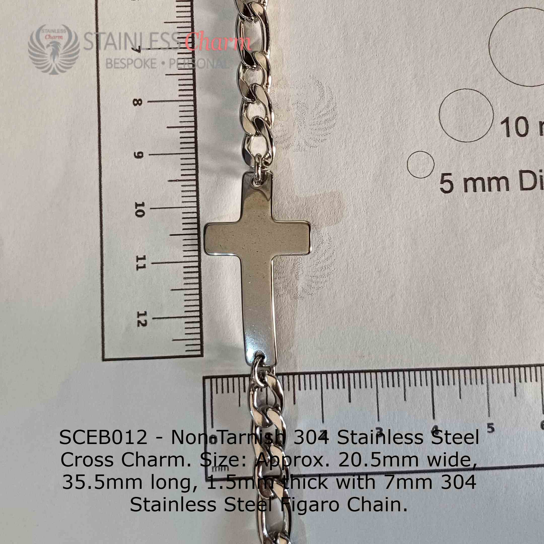 Non-Tarnish 304 Stainless Steel Cross Charm. Size: Approx. 20.5mm wide, 35.5mm long, 1.5mm thick with 7mm 304 Stainless Steel Figaro Chain. (SKU-SCEB012)