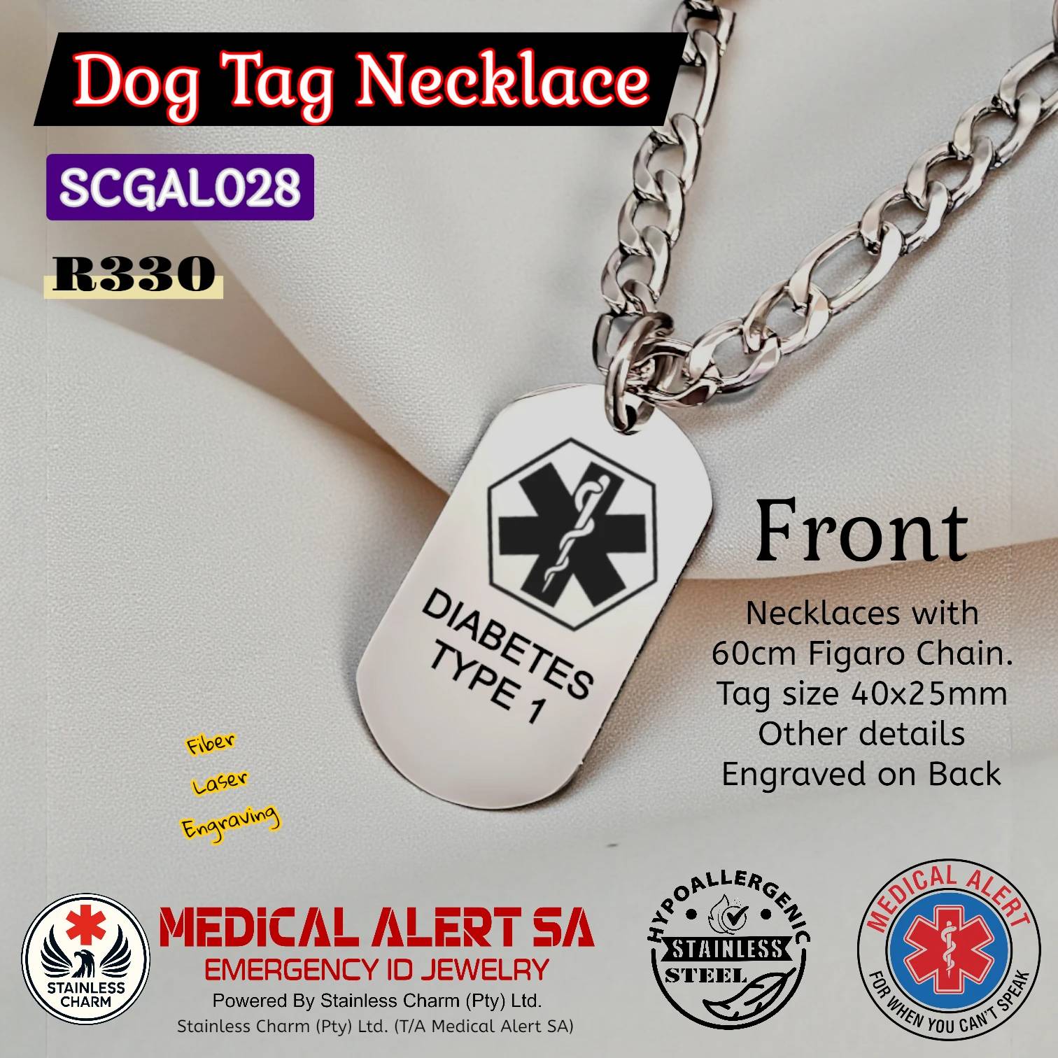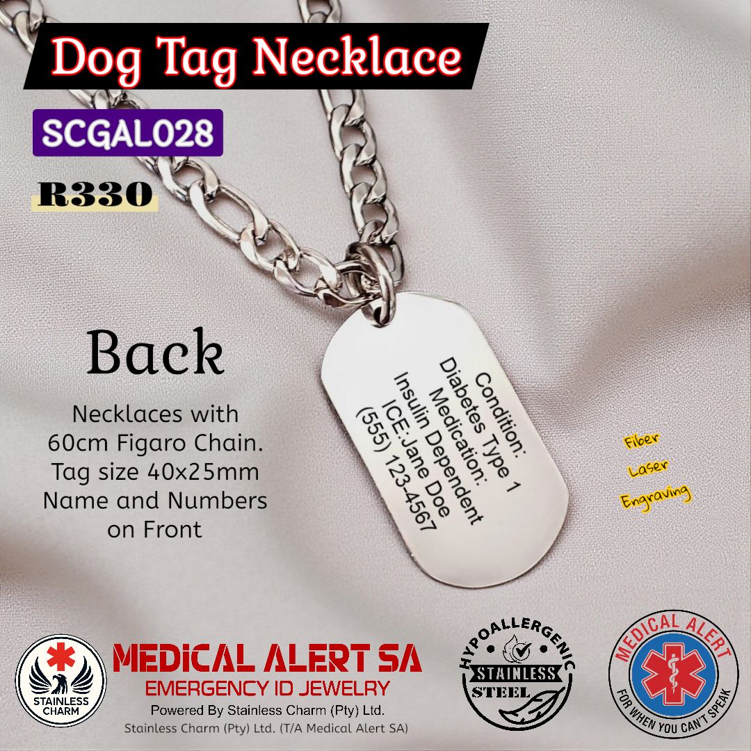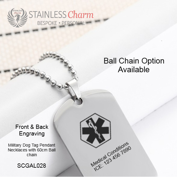Stainless Steel Necklaces - Medical AlertMedical Alert Military Dog Tag Pendant Necklaces with Ball Chain. Tag size 40x25mm. All Tarnish resistant stainless steel. (R270)
