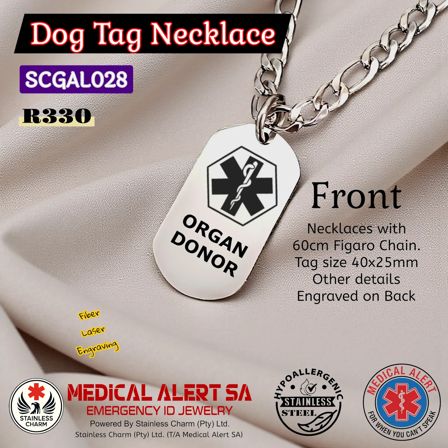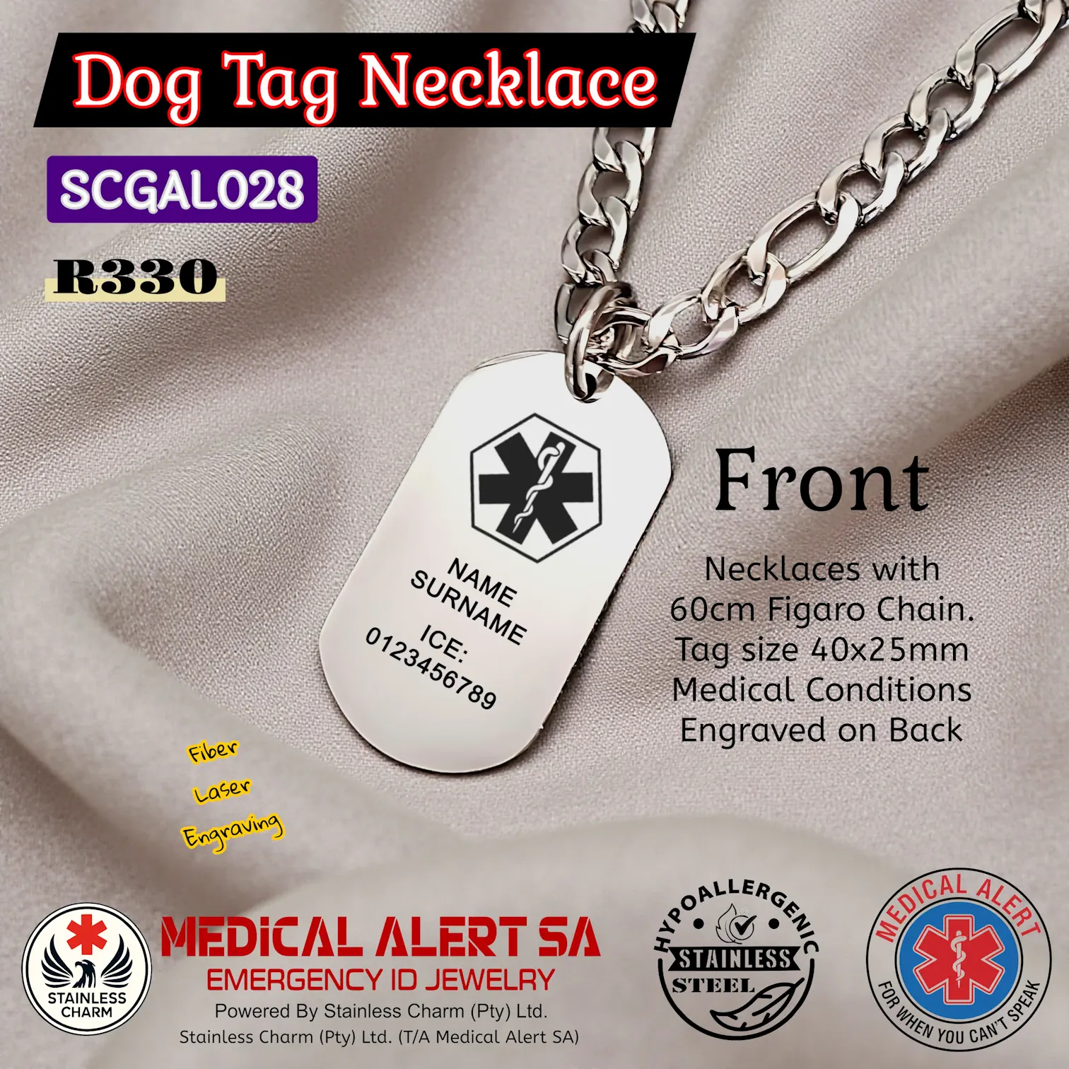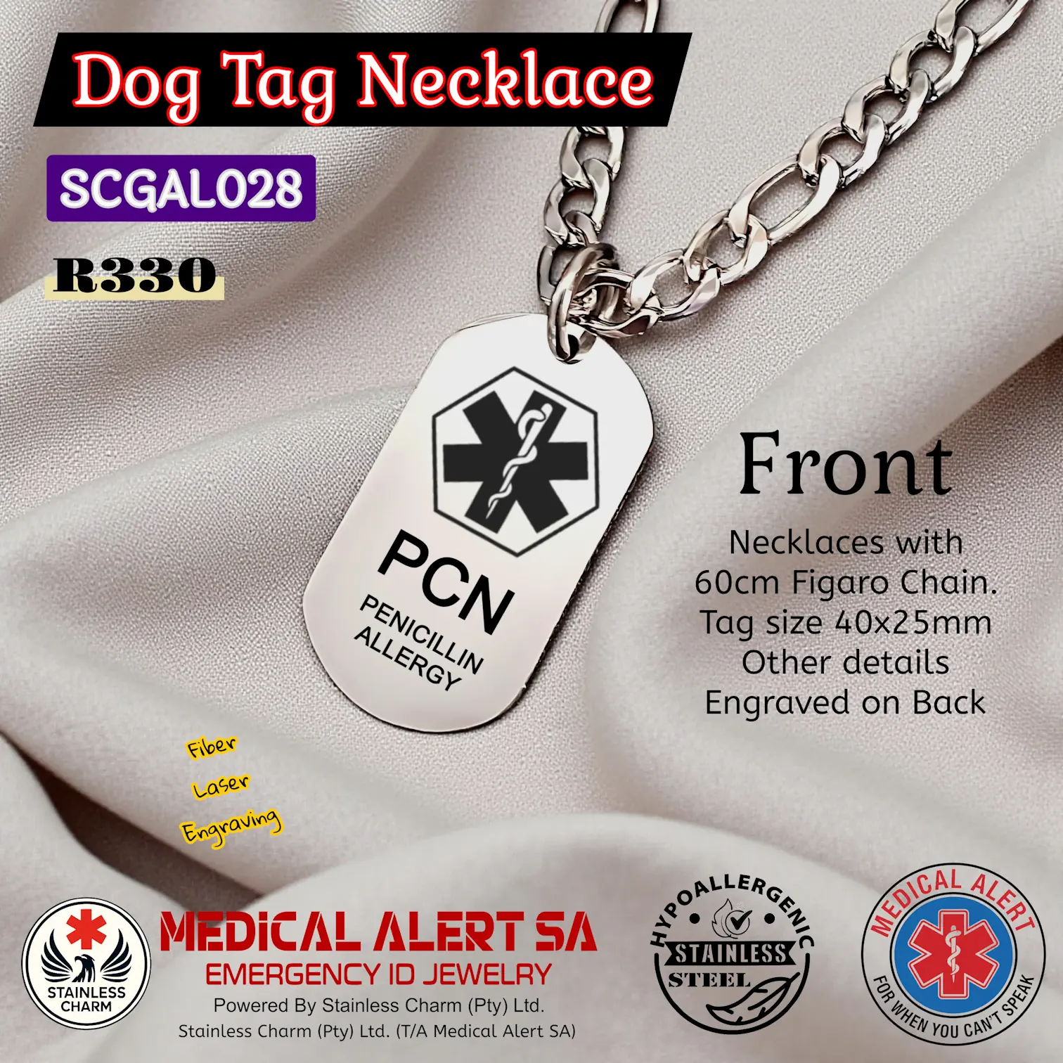 Stainless Steel Necklaces - Medical AlertMedical Alert Military Dog Tag Pendant Necklaces with Ball Chain. Tag size 40x25mm. All Tarnish resistant stainless steel. (R270)