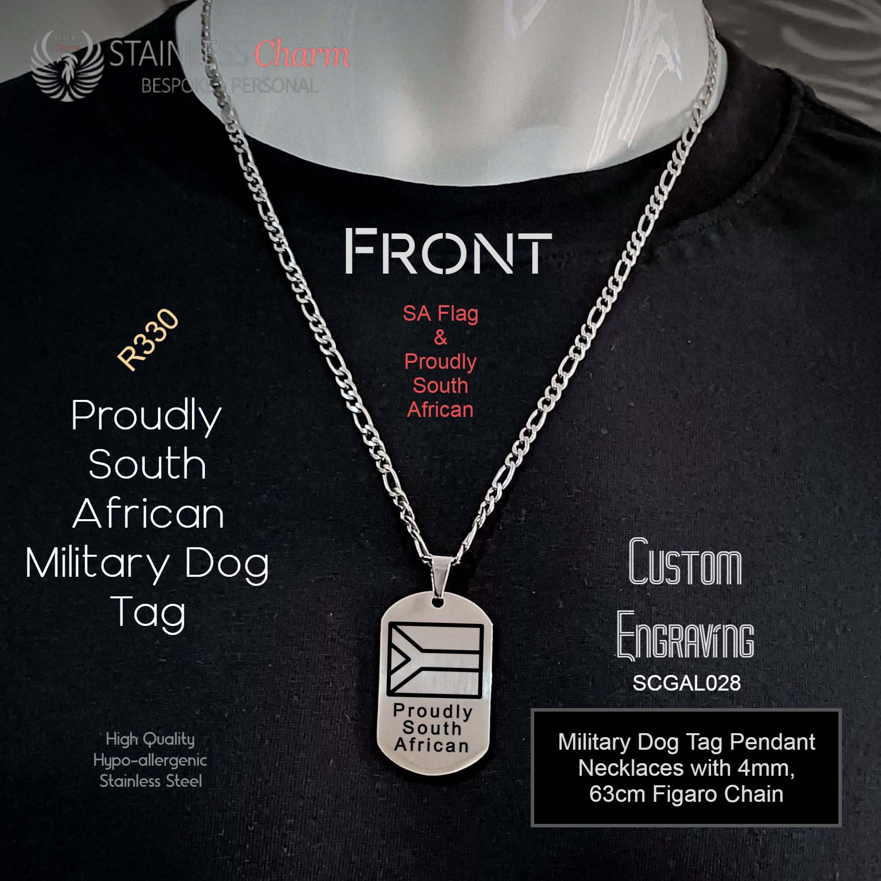 Necklaces with 60cm Figaro Chain. Tag size 40x25mm. All stainless steel, tarnish-resistant.