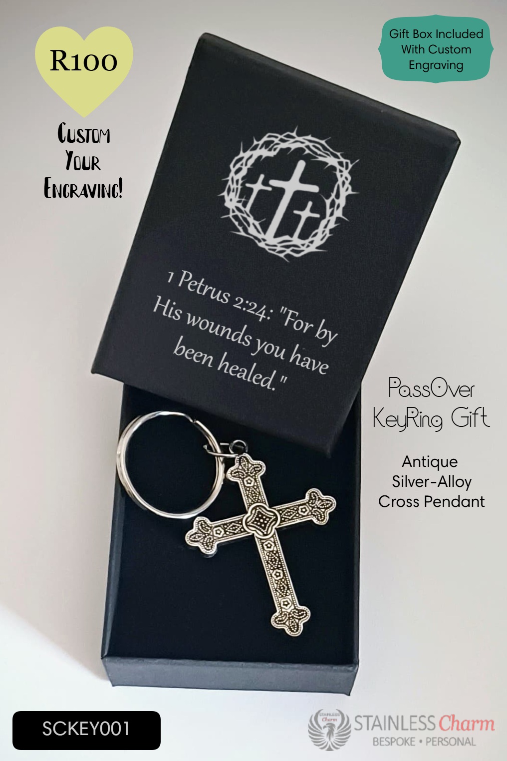Carry a symbol of faith and hope wherever you go with this elegant cross keyring. Encased in a sleek black gift box with custom engraving, this keyring serves as a powerful reminder of spiritual healing and love. The engraving features three crosses surrounded by a crown of thorns, along with the inspiring verse: “For by His wounds you have been healed” – 1 Peter 2:24.