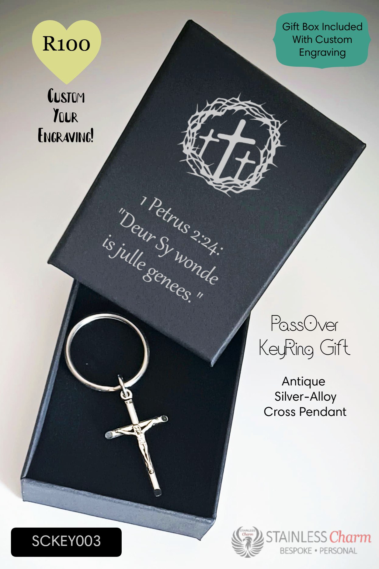 Carry a timeless symbol of faith and healing with this beautifully crafted crucifix keyring. Presented in a sleek black gift box, it’s engraved with the Afrikaans verse: “Deur Sy wonde is julle genees.” – 1 Petrus 2:24, reminding us of the redemptive power of love and sacrifice.