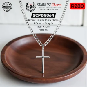 This sleek necklace features a tarnish-resistant 304 stainless steel twisted curb chain, 6mm wide and 60cm in length, with a distinctive textured design. The pendant is a finely crafted cross charm, symbolizing faith, strength, and devotion.