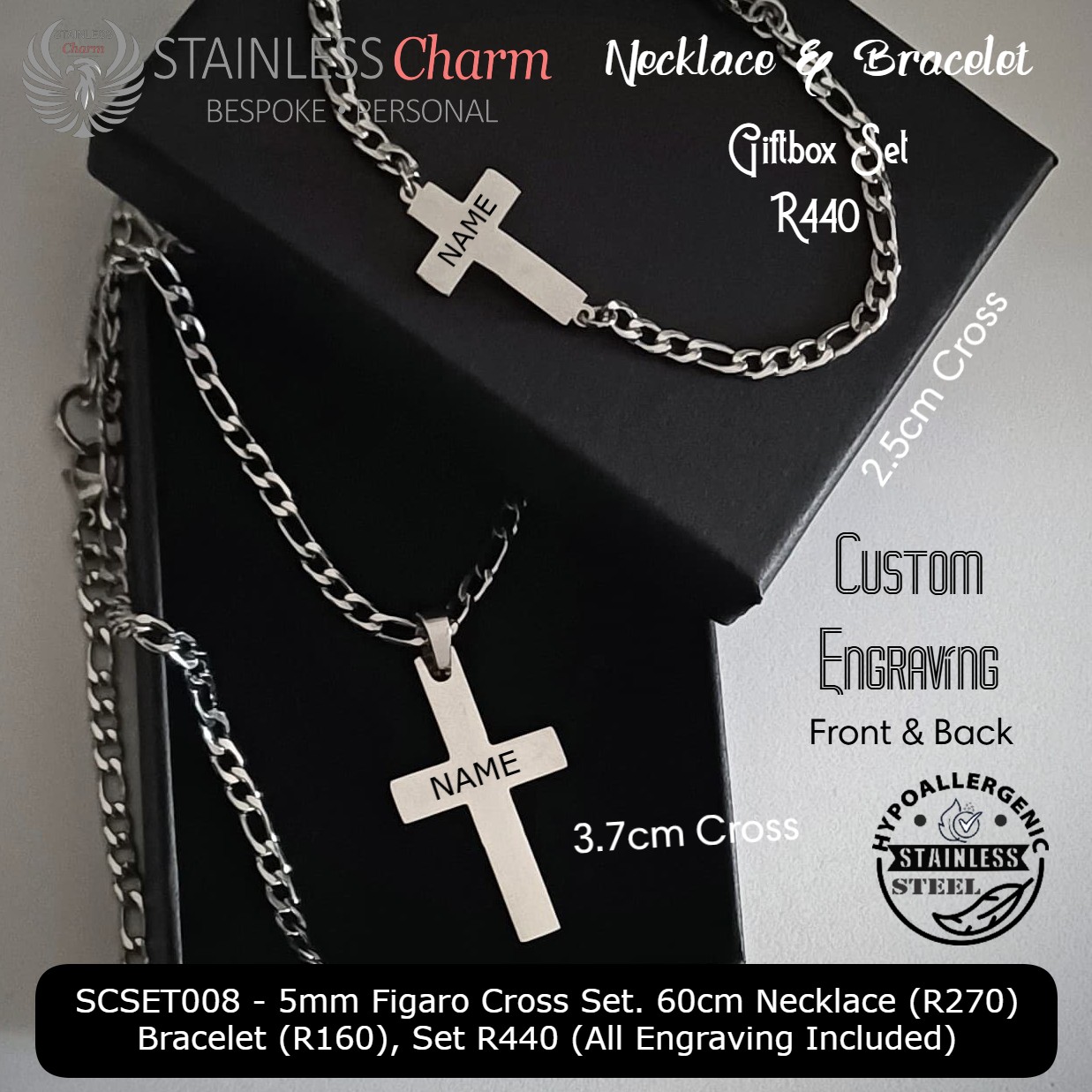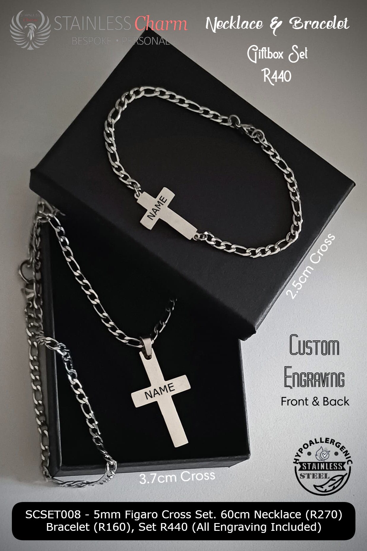 Carry faith and meaning with you every day with this hypoallergenic stainless steel cross set, beautifully crafted for lasting shine and durability. Featuring a 3.7cm engraved cross necklace and a 2.5cm cross bracelet, both pieces allow for custom engraving on the front and back — making them uniquely yours.