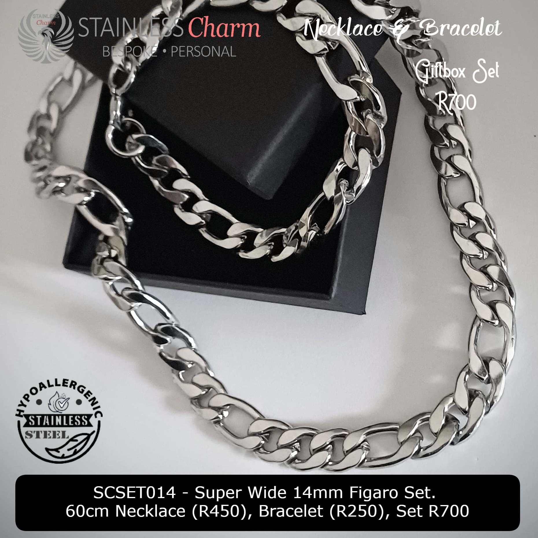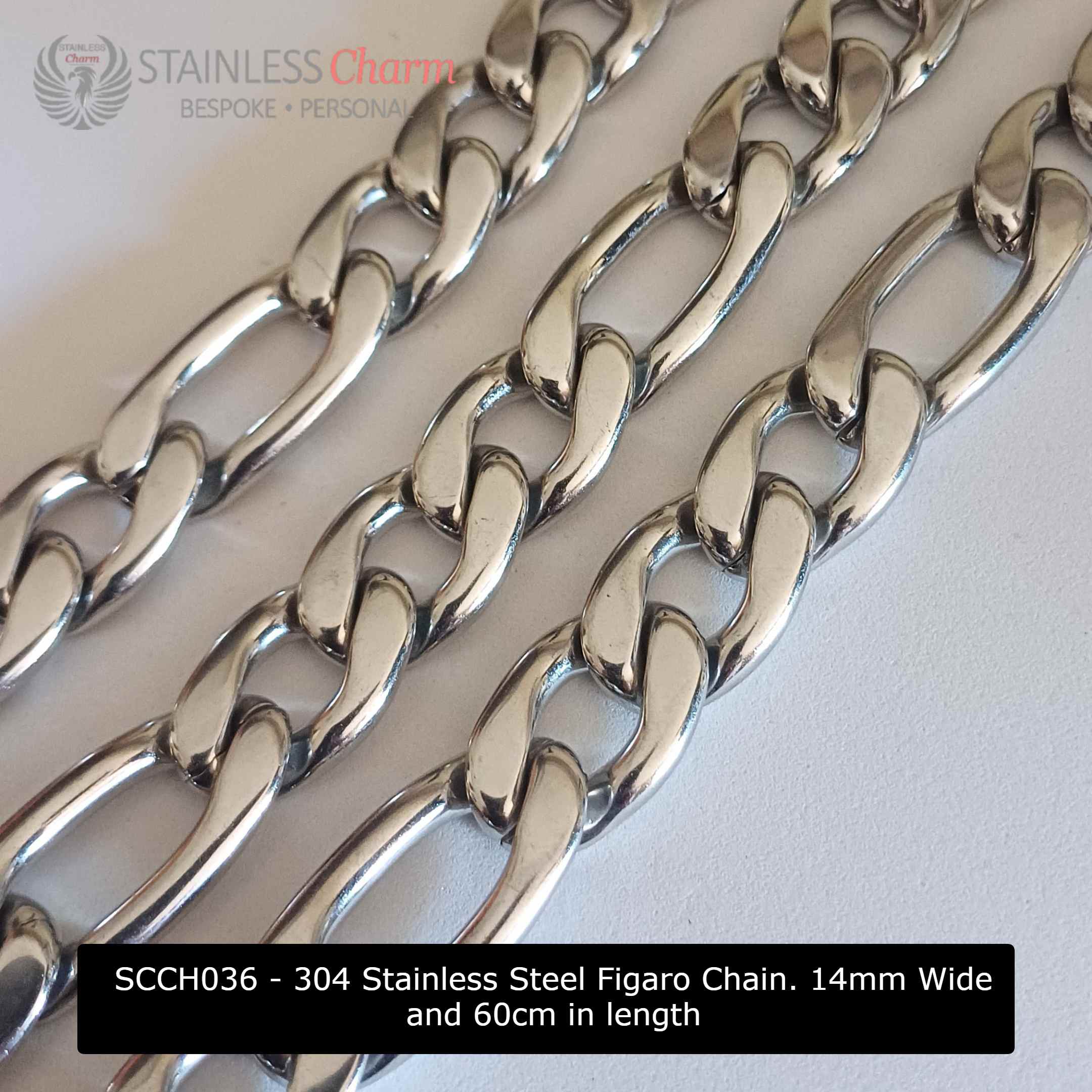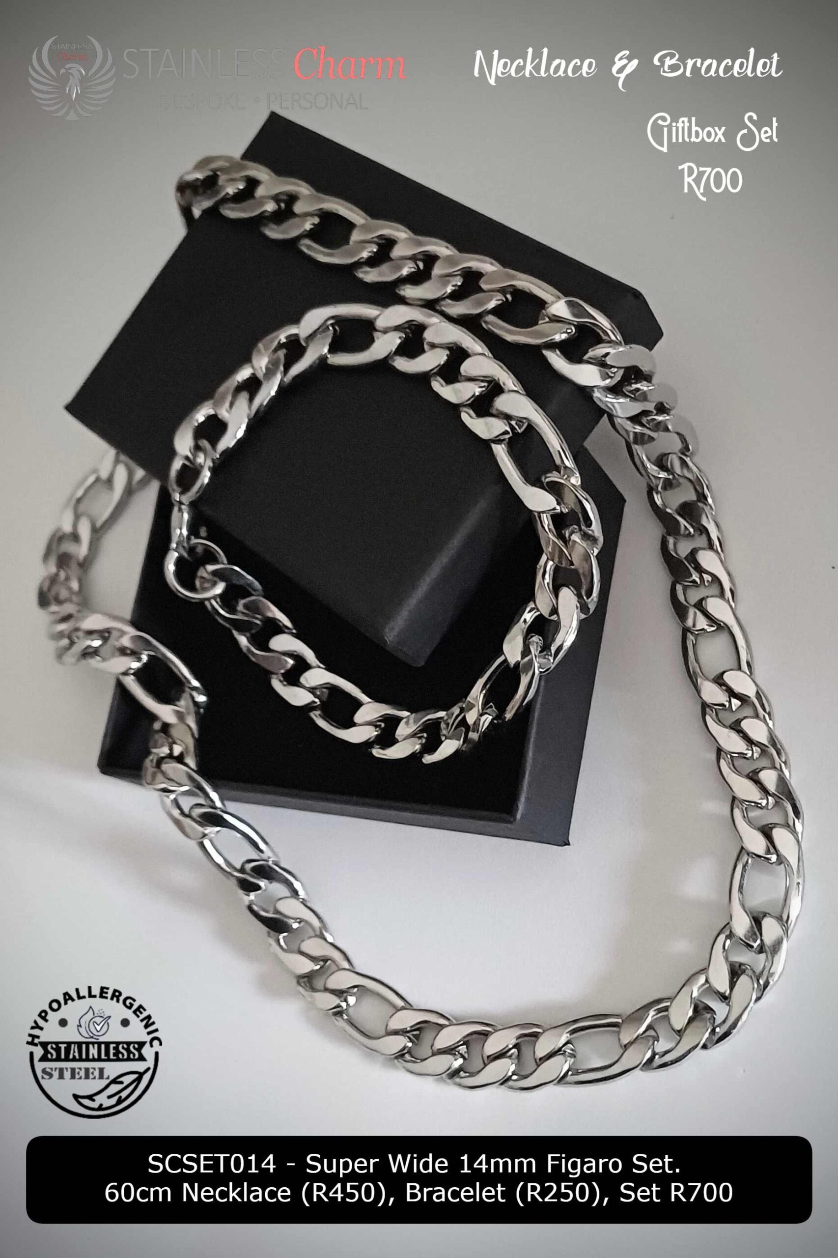 Elevate your style with this bold and sophisticated 14mm Figaro chain & bracelet set, crafted from hypoallergenic stainless steel for lasting durability and shine. The 60cm necklace pairs seamlessly with the matching bracelet, making it a standout statement piece.
