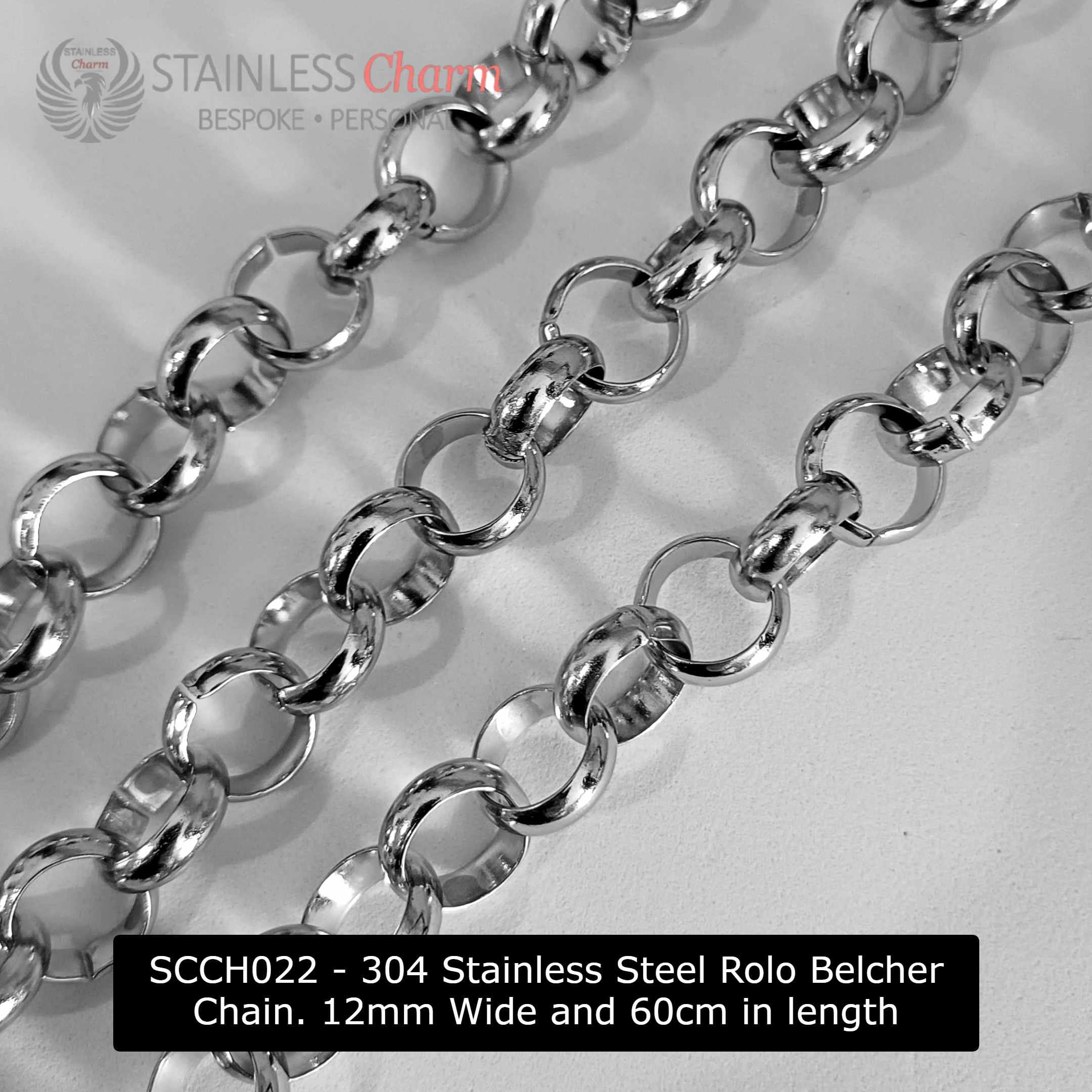 304 Stainless Steel Rolo Belcher Chain. 12mm Wide and 60cm in length