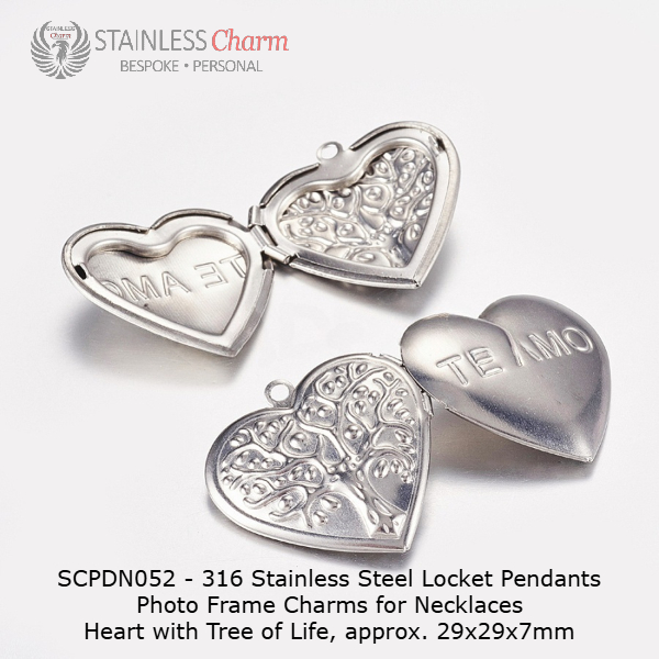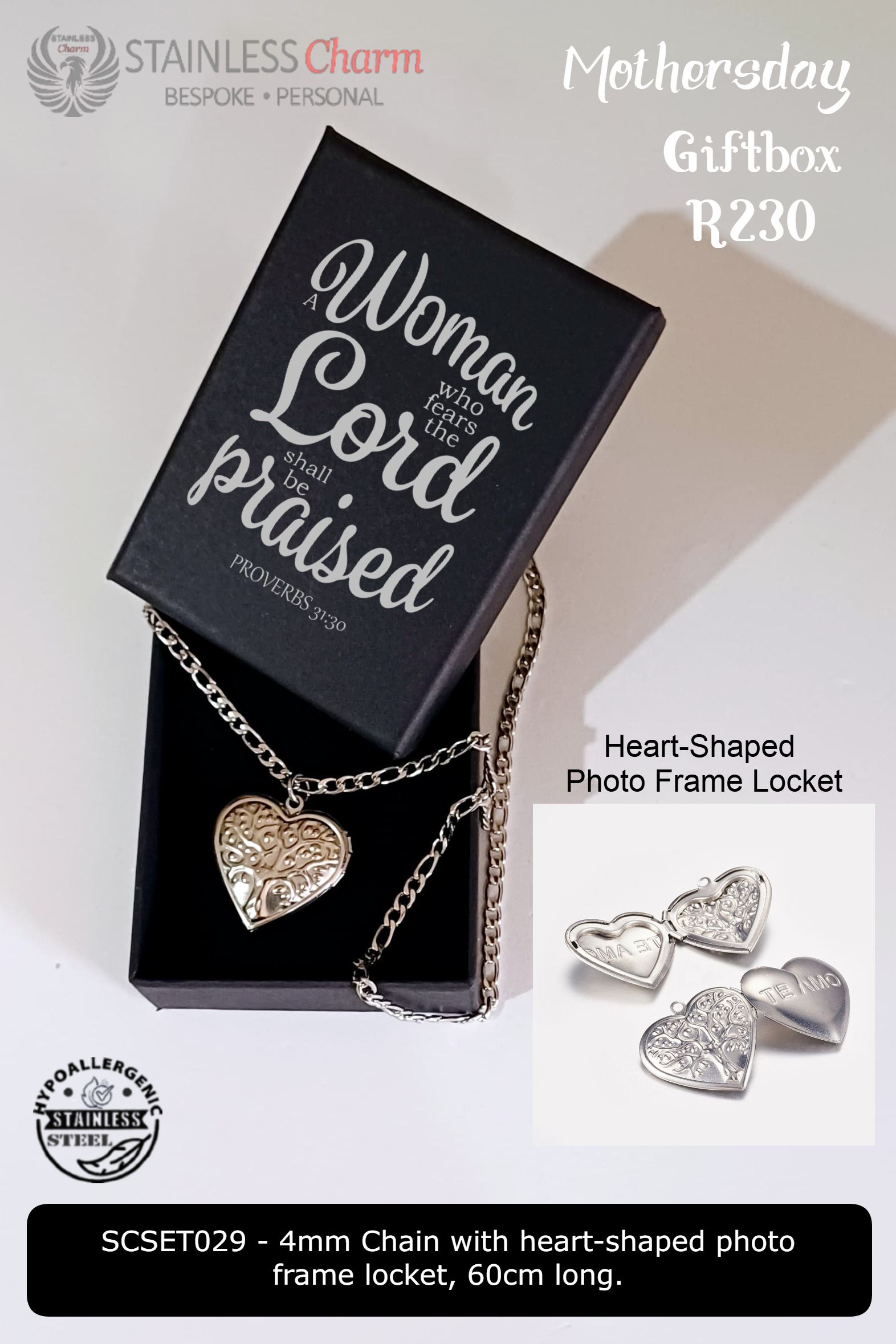 - A heart-shaped photo frame locket on a 4mm stainless steel chain, 60cm long