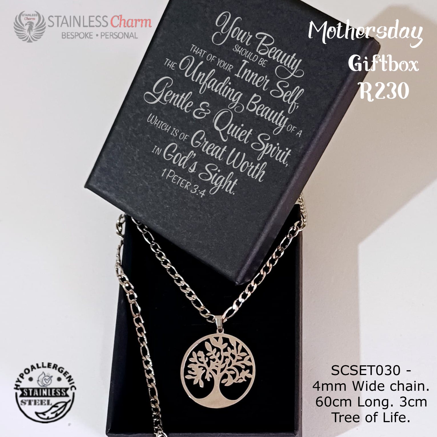 - Inscribed with 1 Peter 3:4: “Your Beauty should be that of your Inner Self, the Unfading Beauty of a Gentle & Quiet Spirit, which is of Great Worth in God’s Sight.”